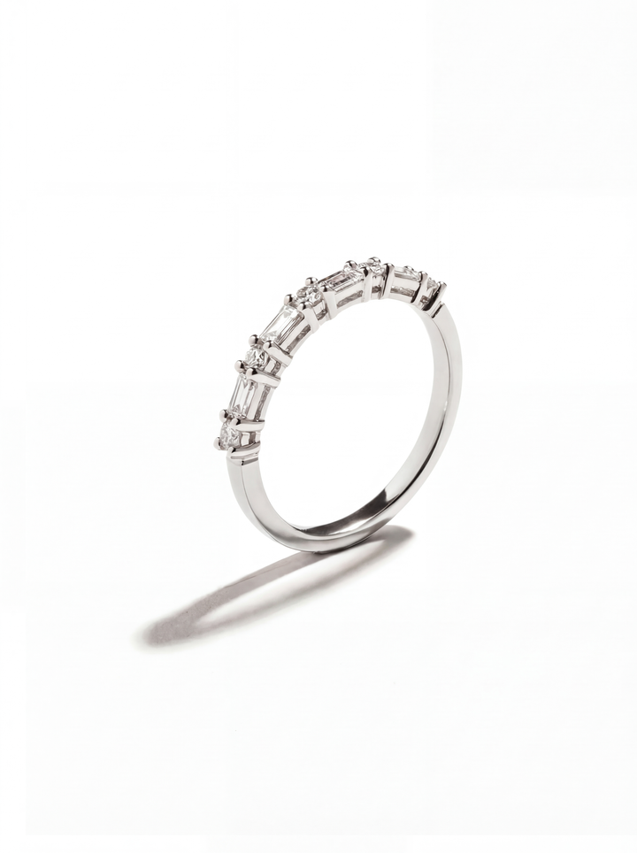 階梯切割鑽石以清晰比例勾勒結構感,圓形明亮鑽則為戒指注入自然流動的光影,使半圈排列在佩戴時不顯單調,反而隨手部動作展現不同面向的細膩變化。設計簡潔卻不失重點,適合日常佩戴,也能輕鬆融入戒指疊戴搭配之中。