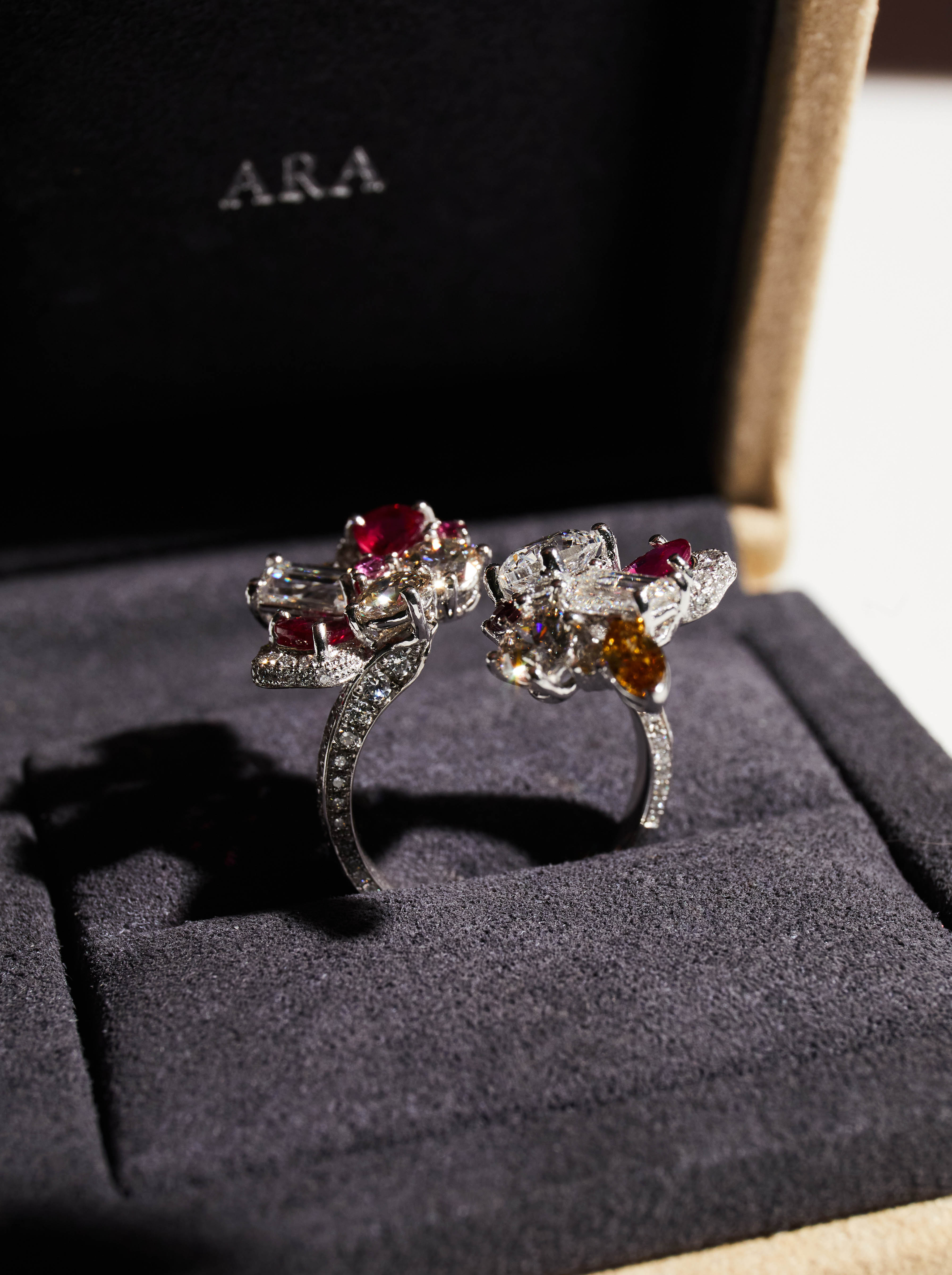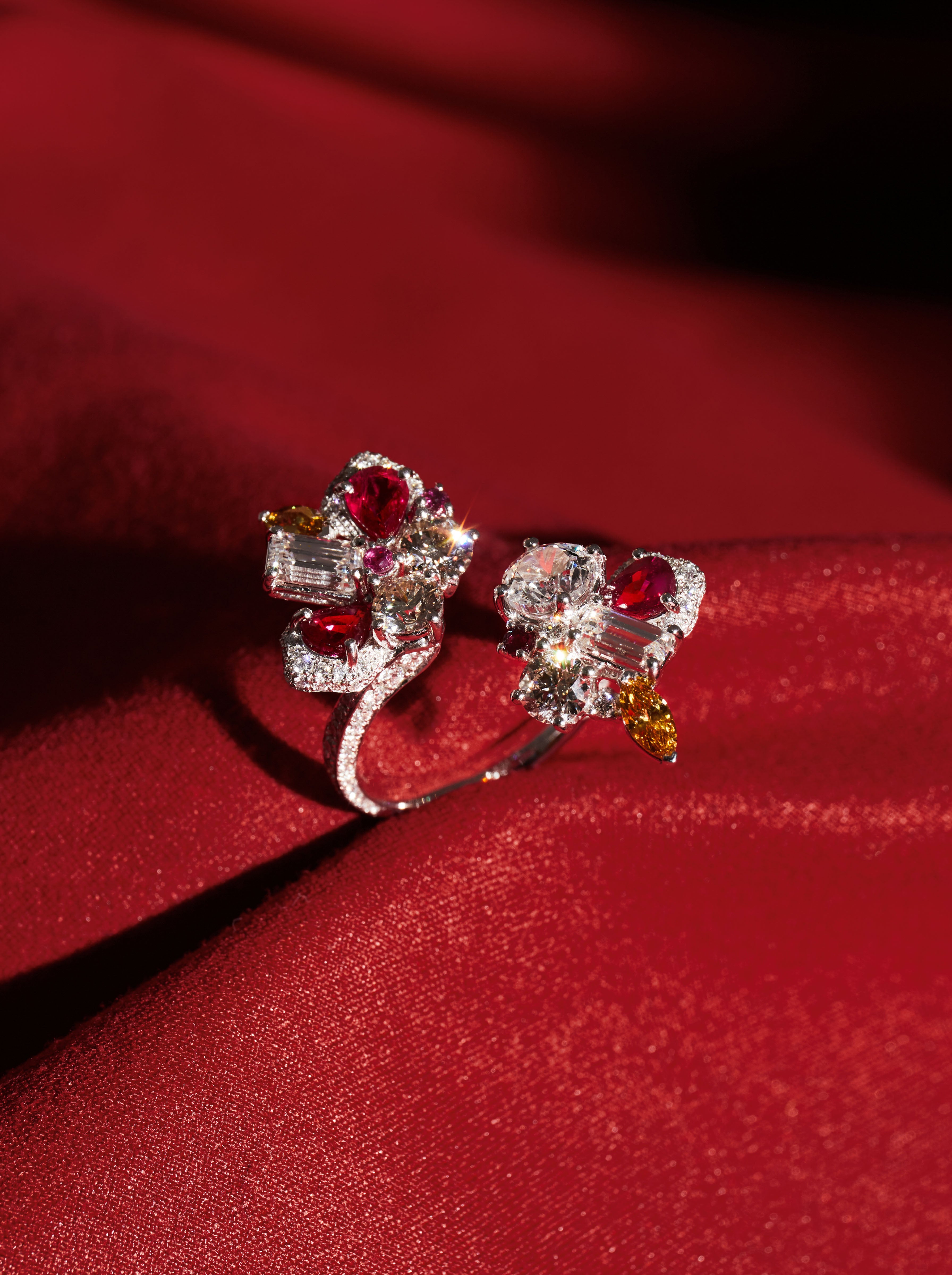 • 以「盛開」為概念的開合戒設計,將客人日積月累收集來的鑽石和彩寶,排列成綻放的花朵;暖色系紅寶石和黃鑽,結合幾何形的公主方和圓鑽,彷彿花瓣和花蕊在指間隨意舞動。