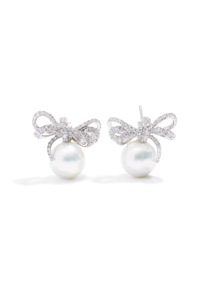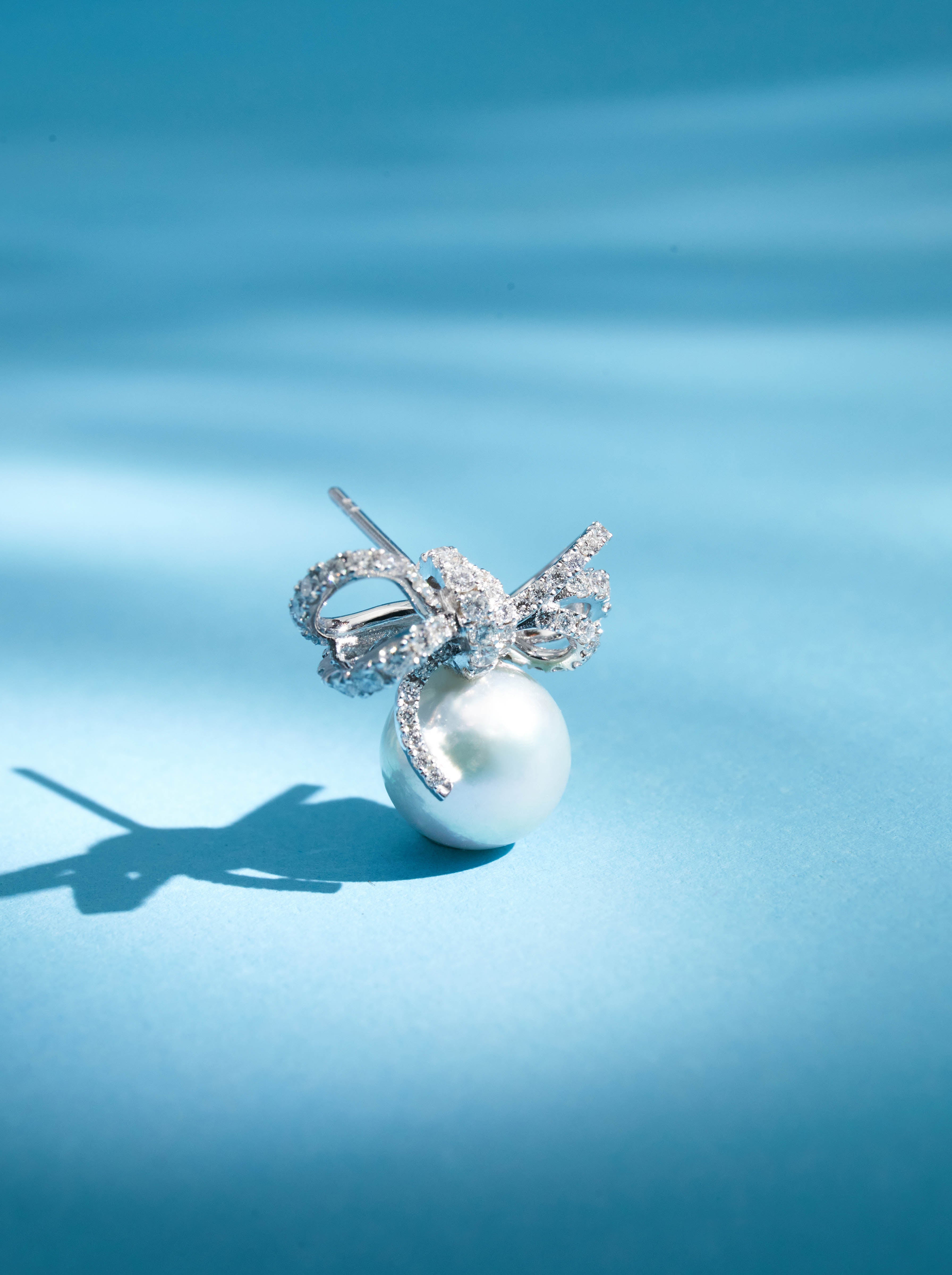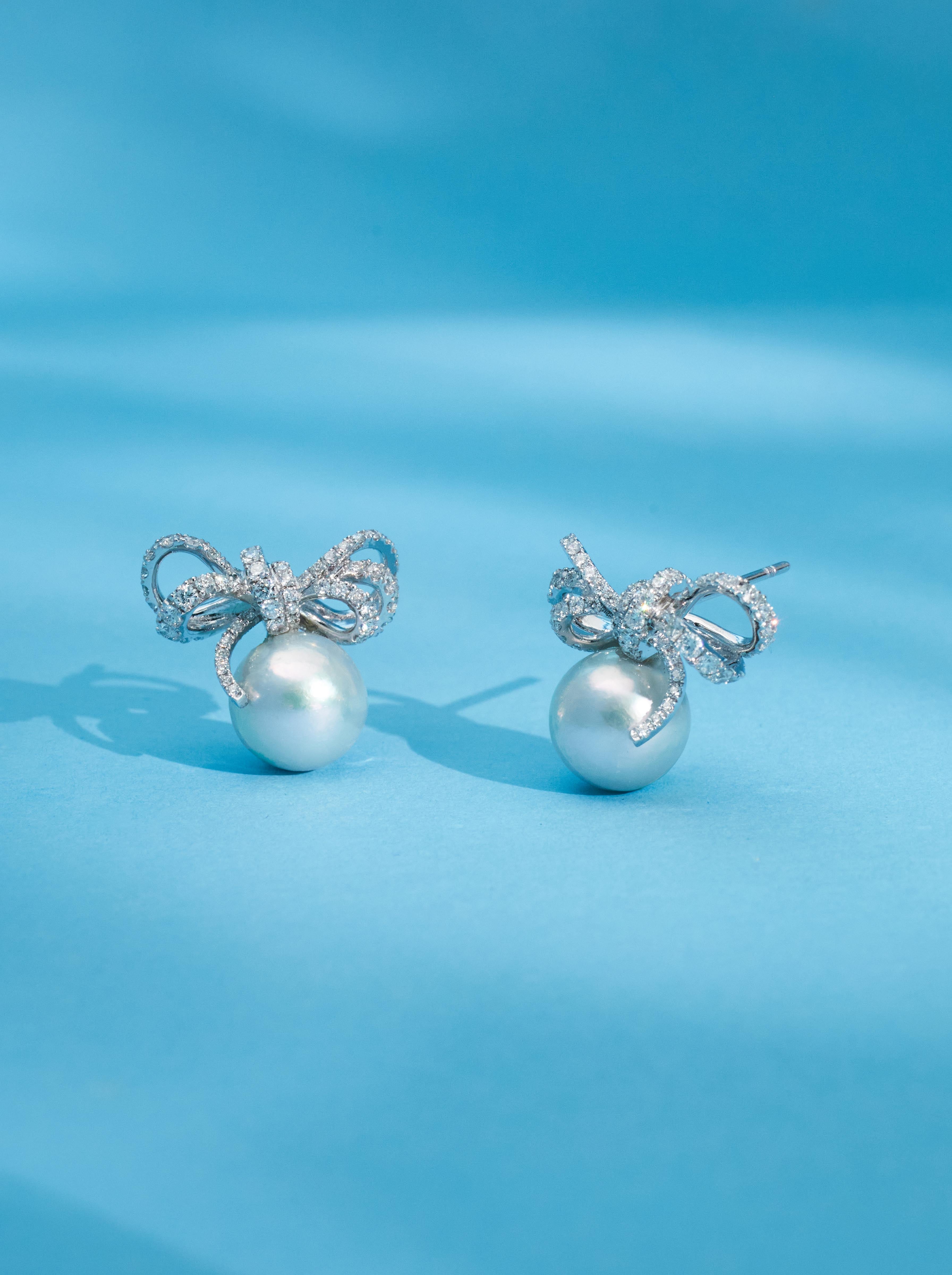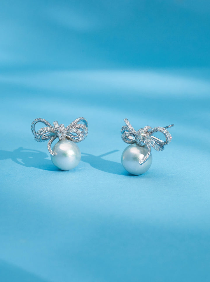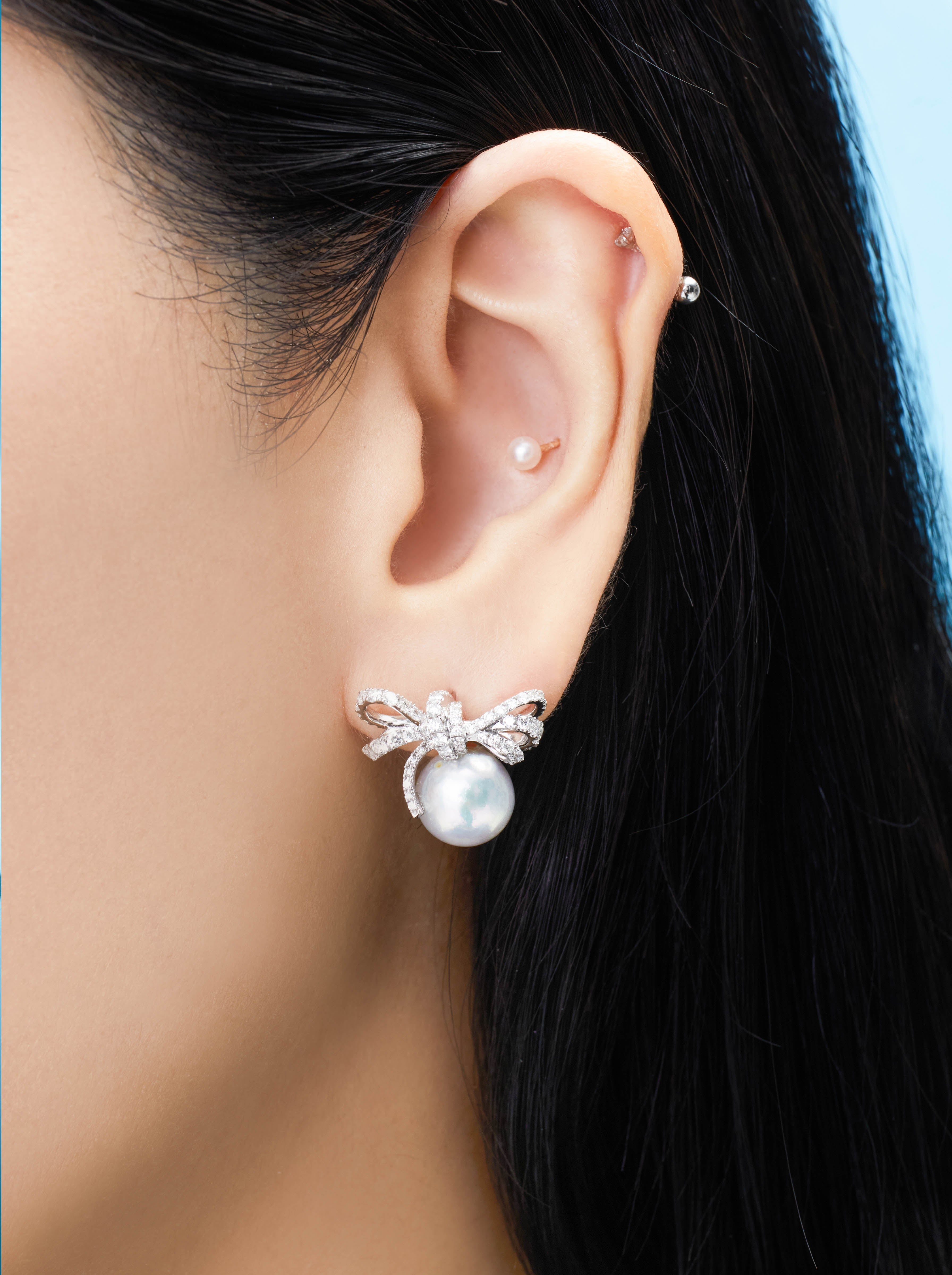 • 擁有柔美氣息的真多麻 Akoya 珍珠,散發著淡藍色的灰銀光澤,猶如一位知性且溫柔的女性,賦予人穩定且自信的力量,結合細緻的鑲鑽蝴蝶結線條,彷彿微風吹過緞帶般栩栩如生地在耳下飄逸。