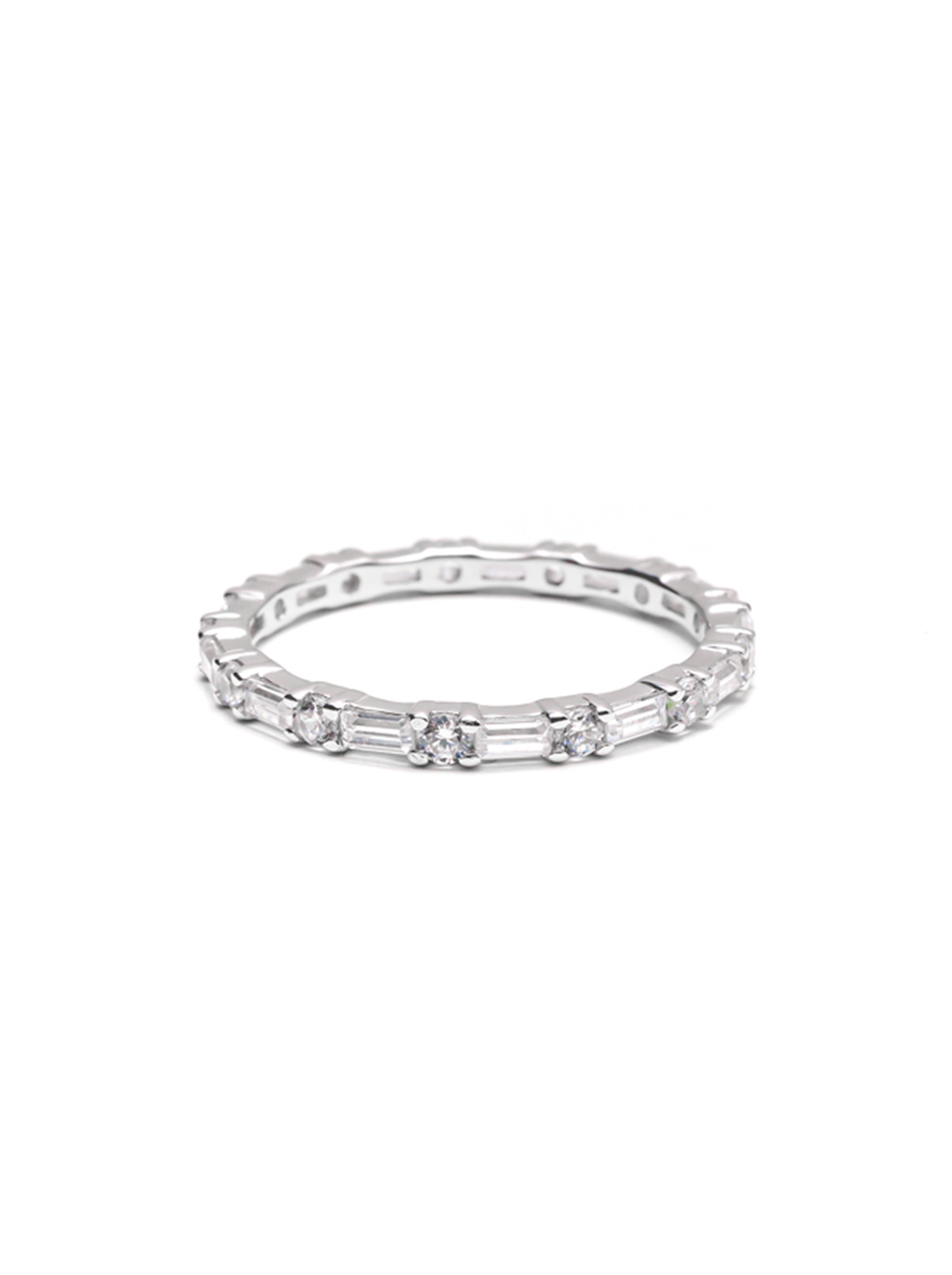 階梯切割鑽石以清晰比例勾勒結構感,圓形明亮鑽則為戒指注入自然流動的光影,使半圈排列在佩戴時不顯單調,反而隨手部動作展現不同面向的細膩變化。設計簡潔卻不失重點,適合日常佩戴,也能輕鬆融入戒指疊戴搭配之中。