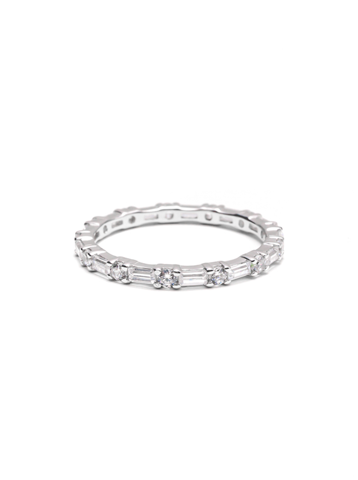 結合長方形階梯切割鑽石的俐落線條,與圓形明亮鑽石的柔和光澤,在戒指上形成節奏分明的視覺層次。