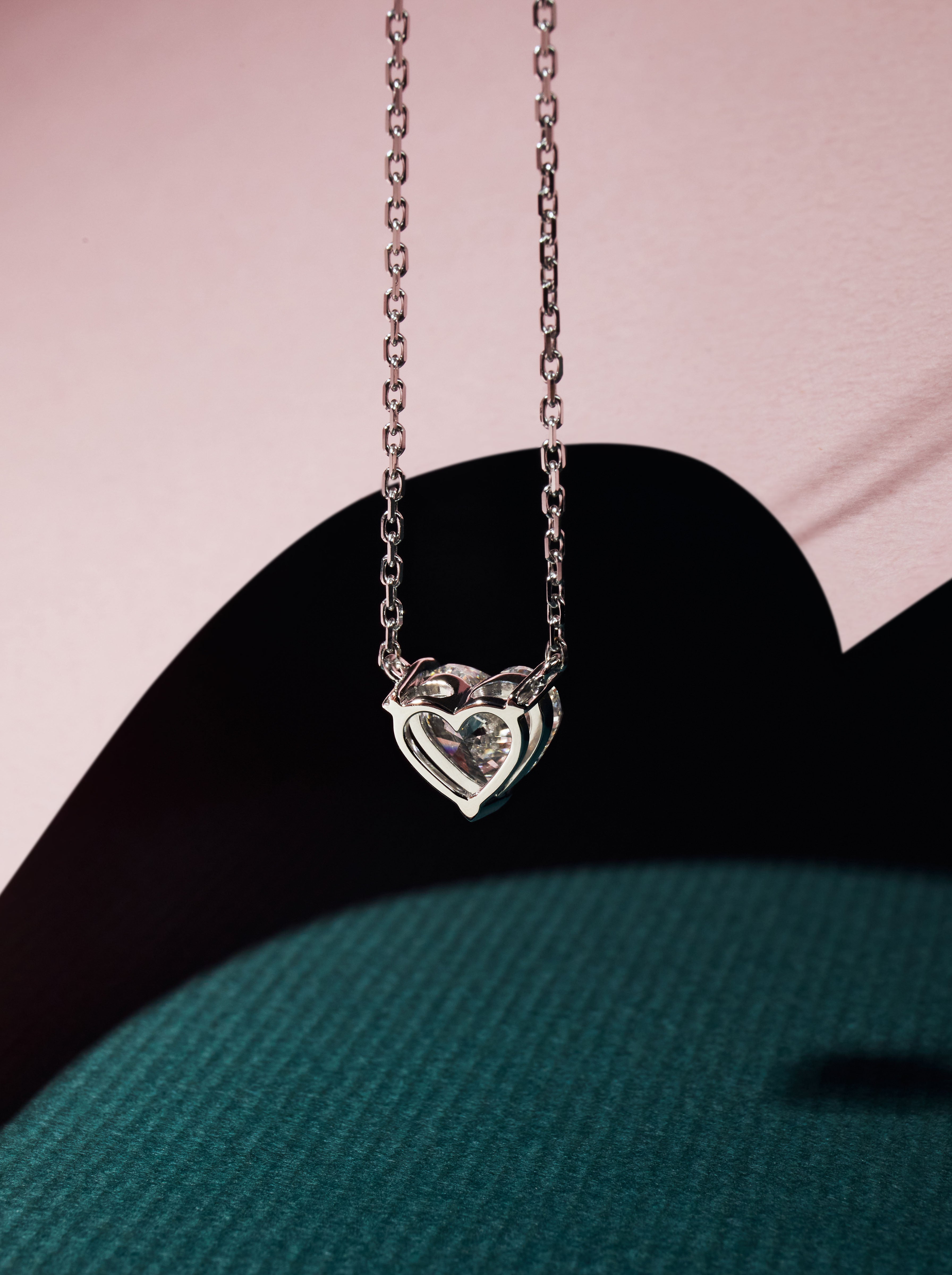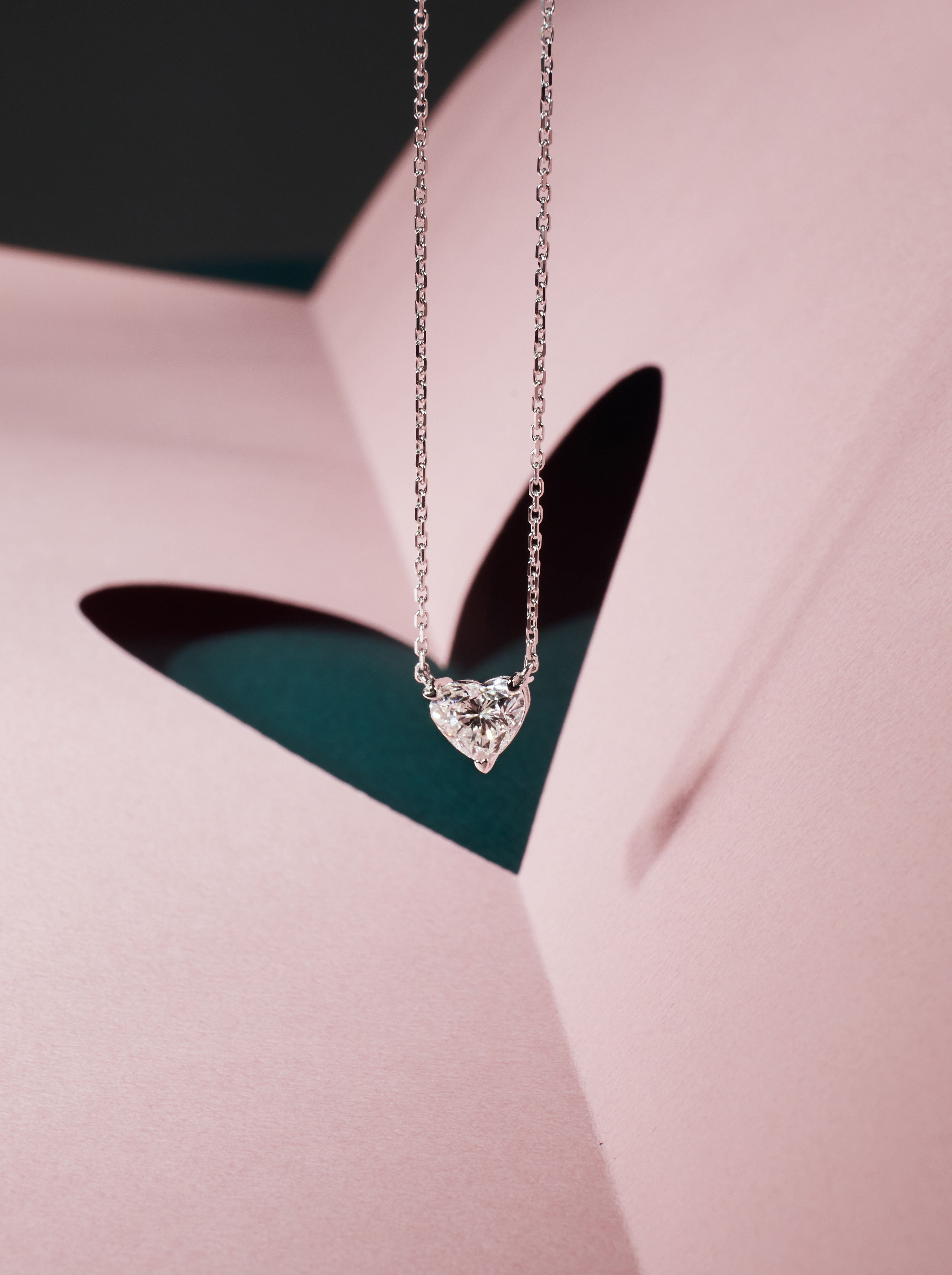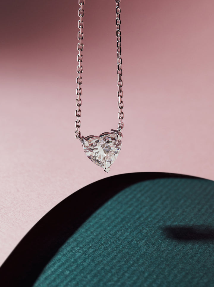 ARA Fine Jewellery 為顧客打造的2克拉、E Color(無色)等級的心形鑽石項鍊,在鑽石的三個端點巧妙地設計了細緻的心型裝飾,增添了精緻感。底座的鏤空設計,使鑽石更加透光明亮,也使心形鑽石更加圓潤飽滿。