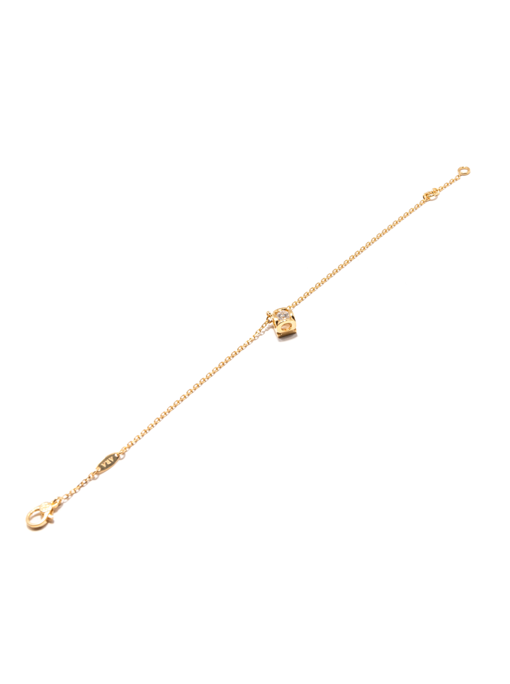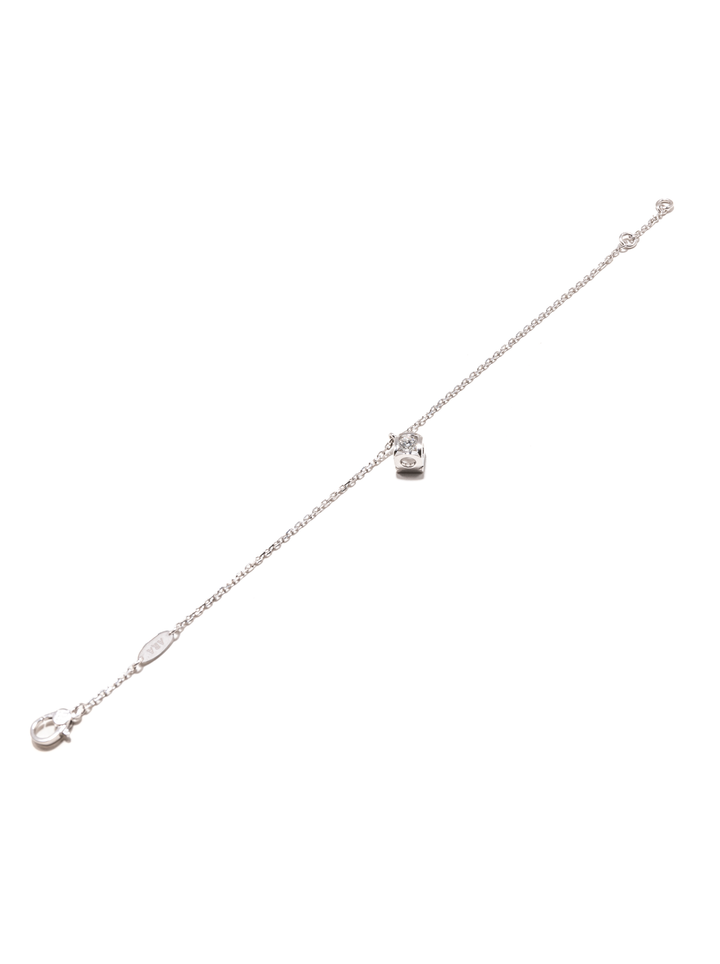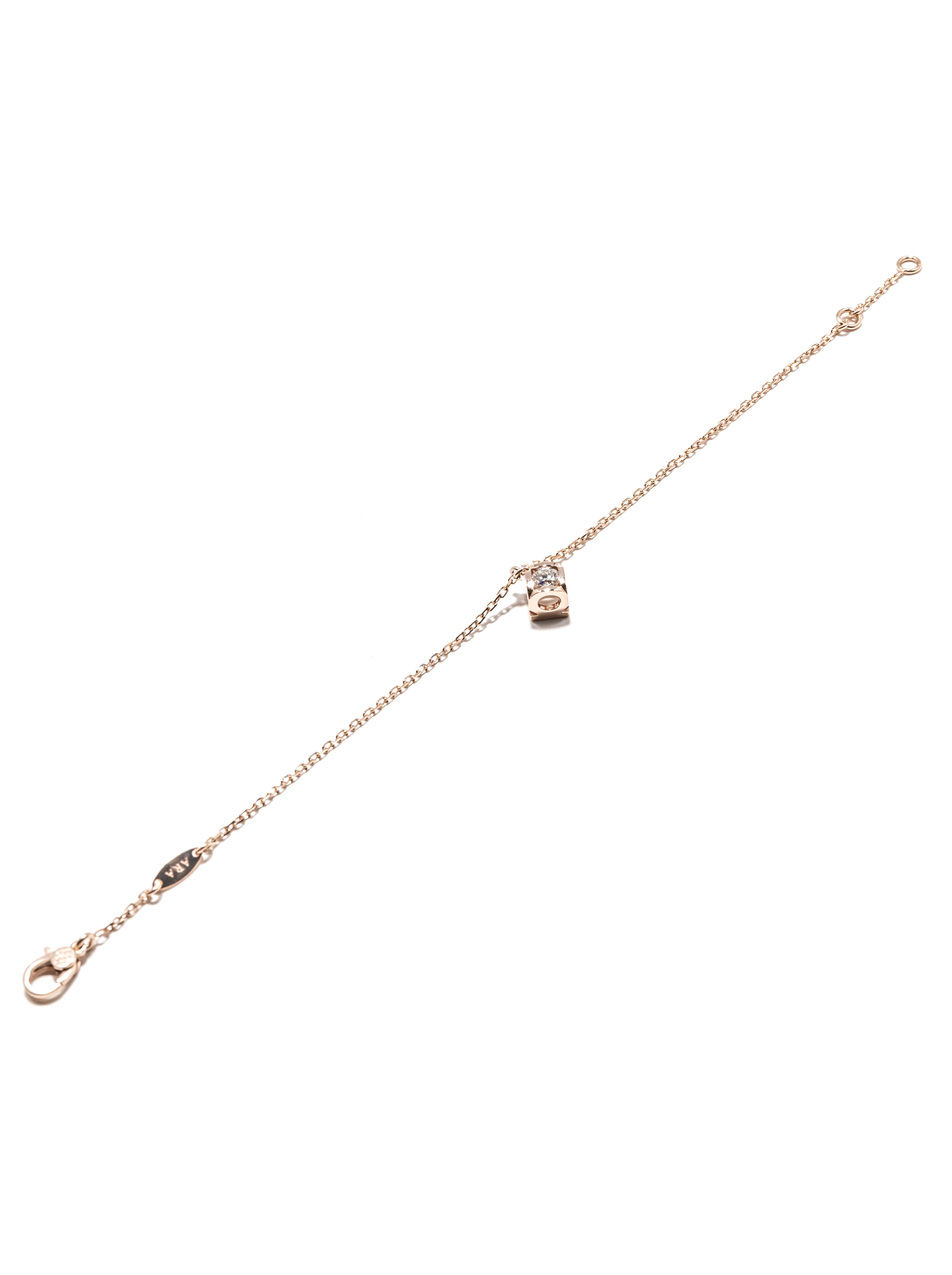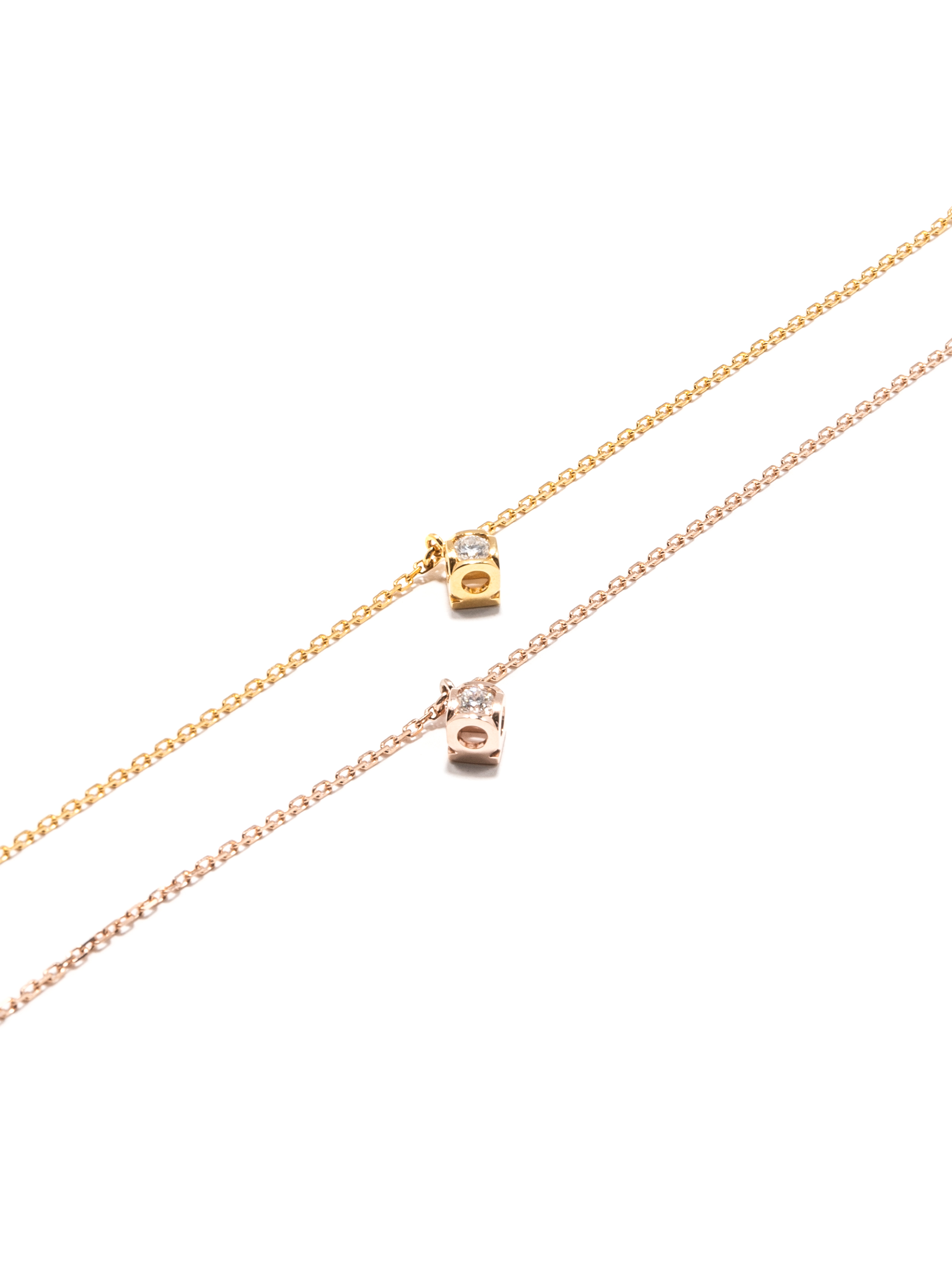 由 18K 金打造的 a 字形立方體托座,擁有方中帶圓的簡約設計,從正面俯視觀看,能為中央的鑽石表面增添視覺份量,若透過側面鏤空的圓形線條,則能欣賞到鑽石的底尖處。