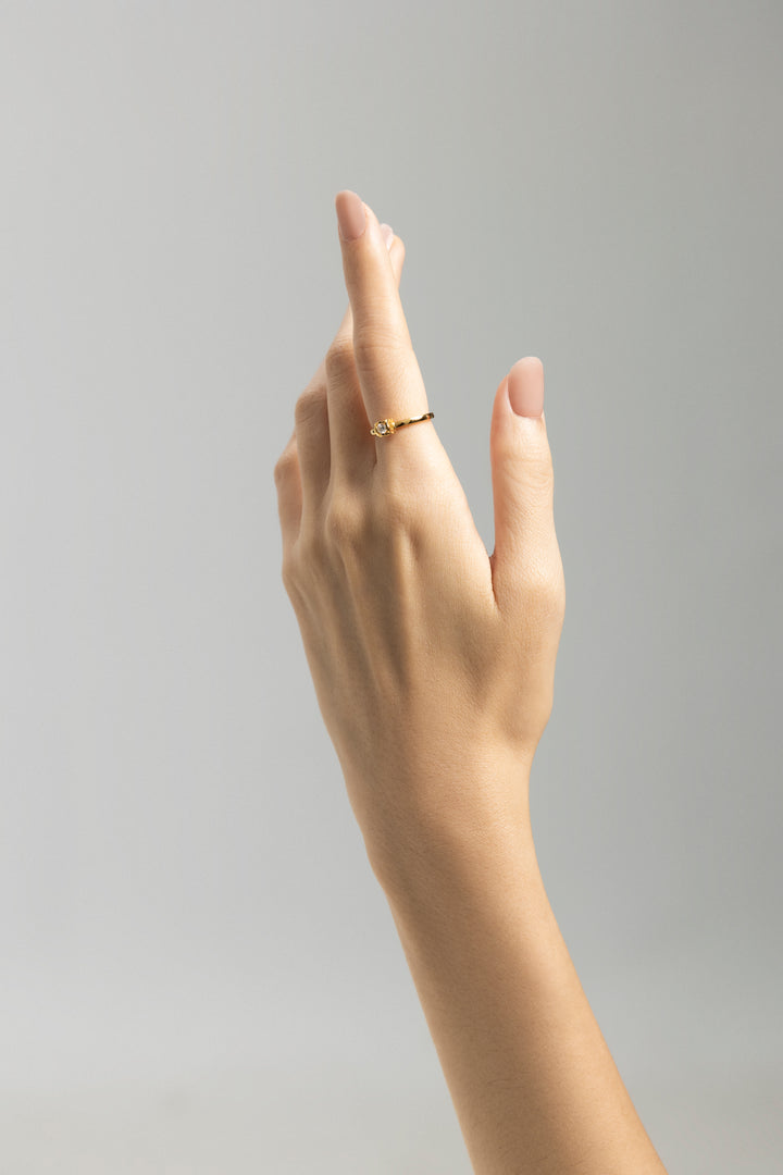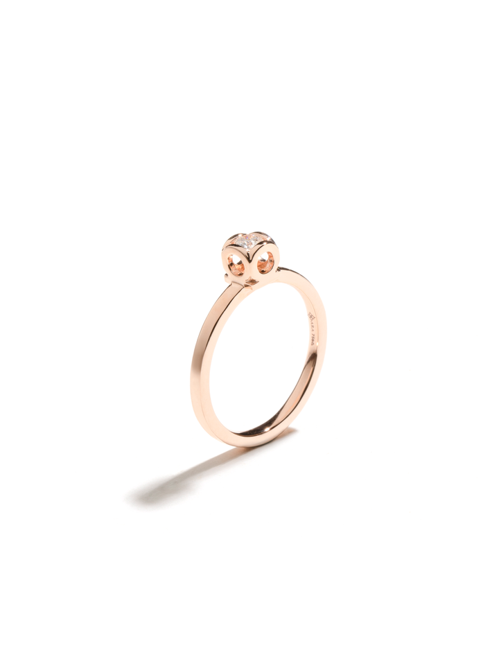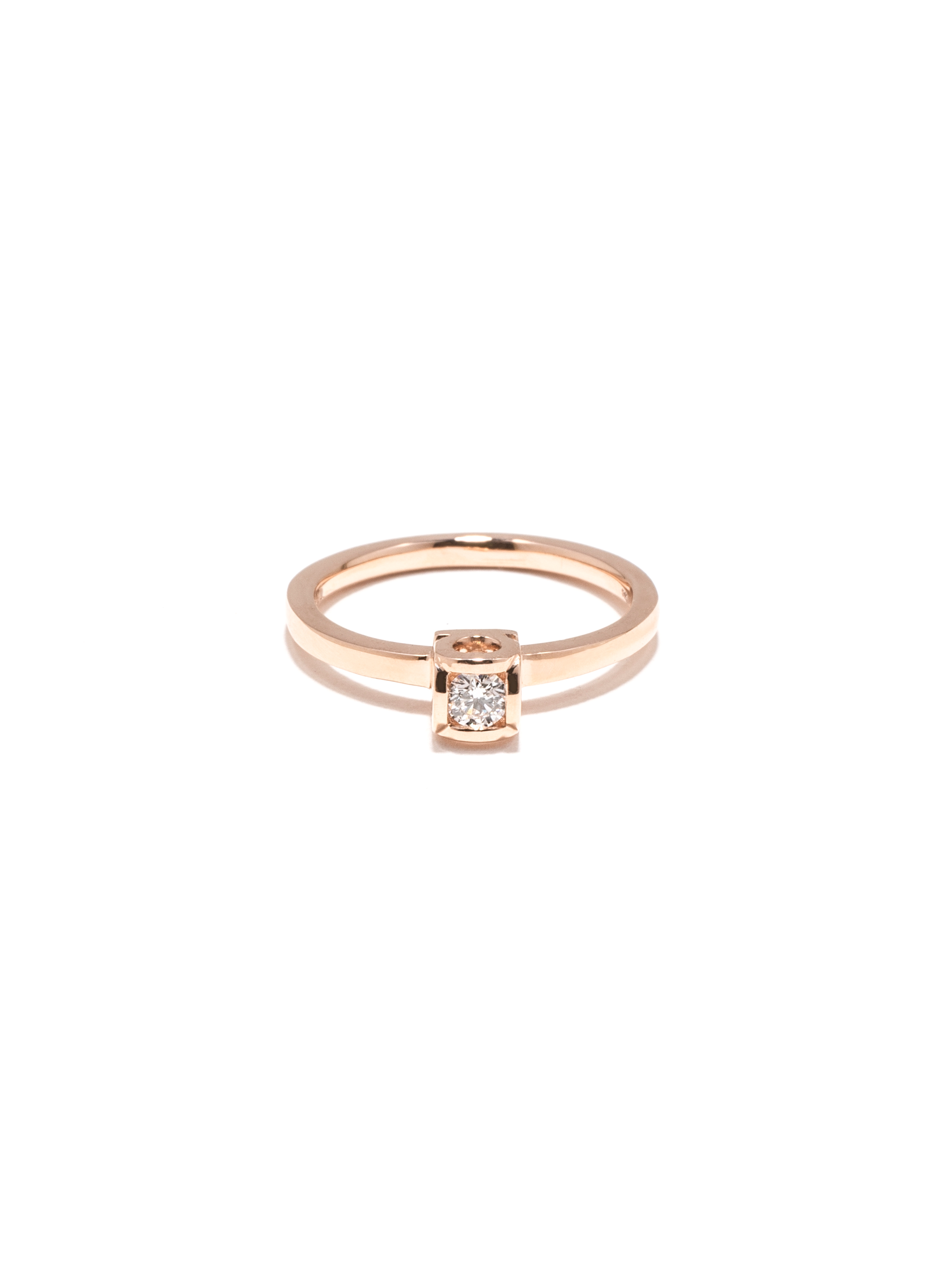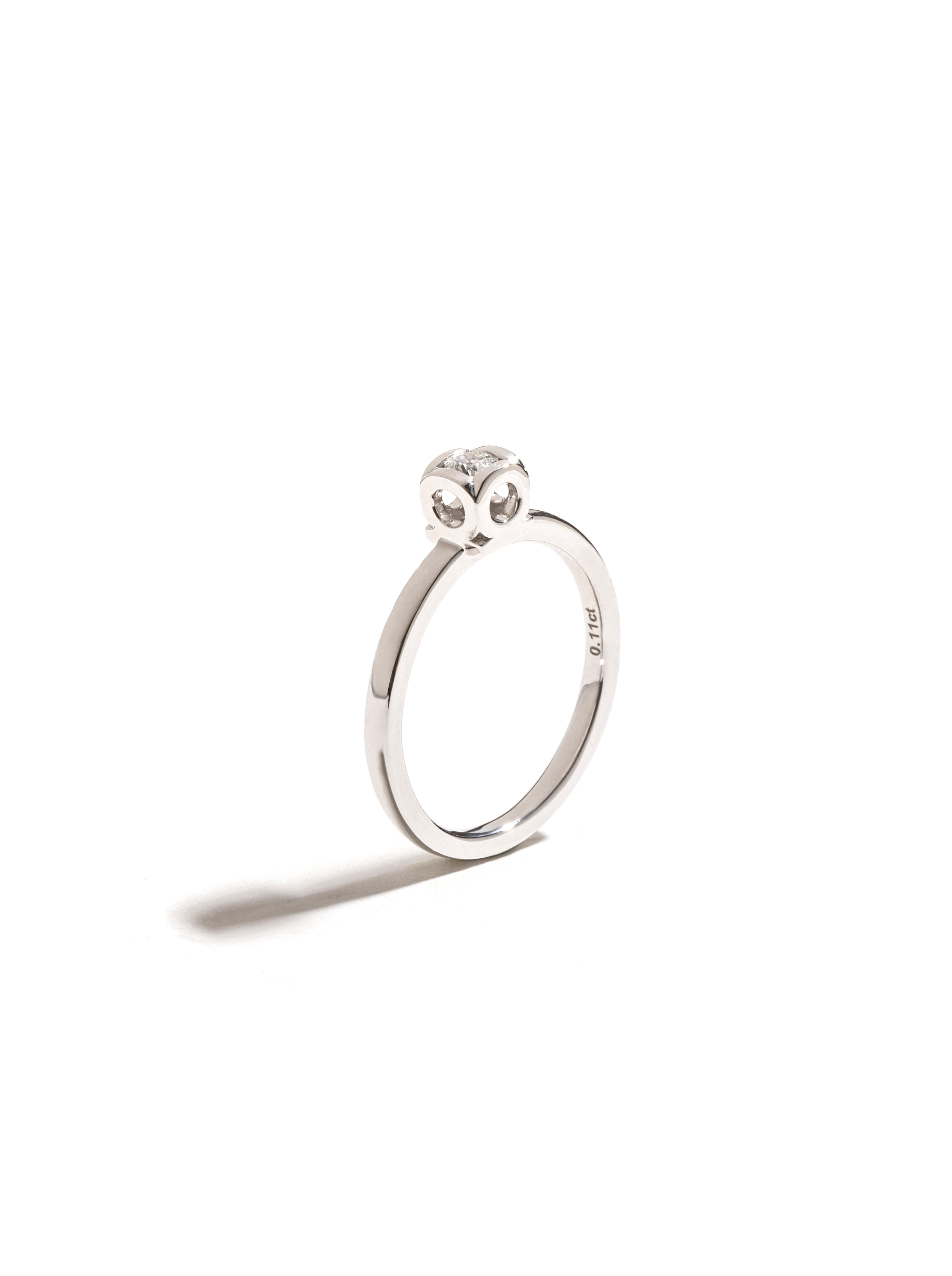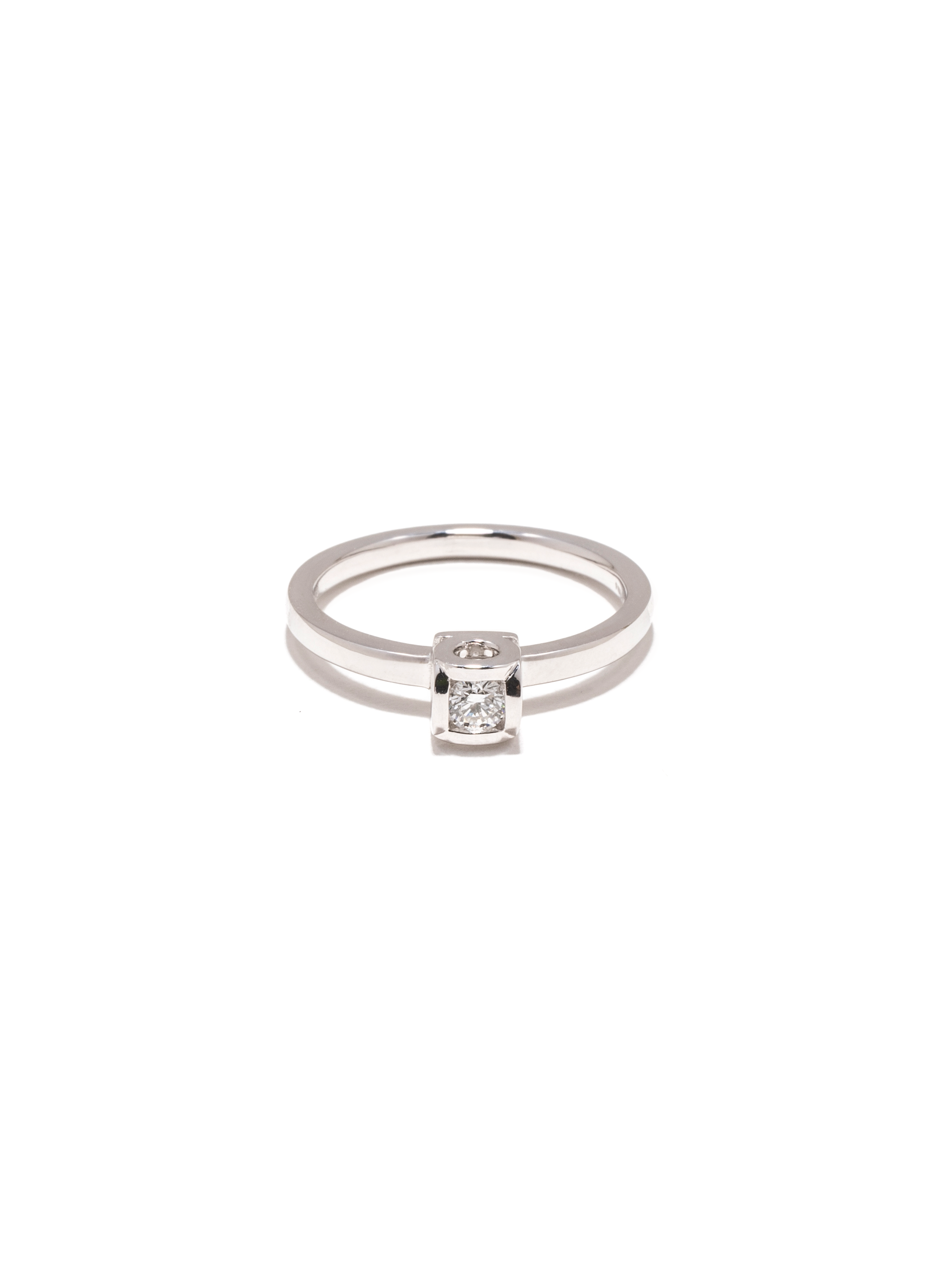 由 18K 金打造的 a 字形立方體托座,擁有方中帶圓的簡約設計,從正面俯視觀看,能為中央的鑽石表面增添視覺份量,若透過側面鏤空的圓形線條,則能欣賞到鑽石的底尖處。