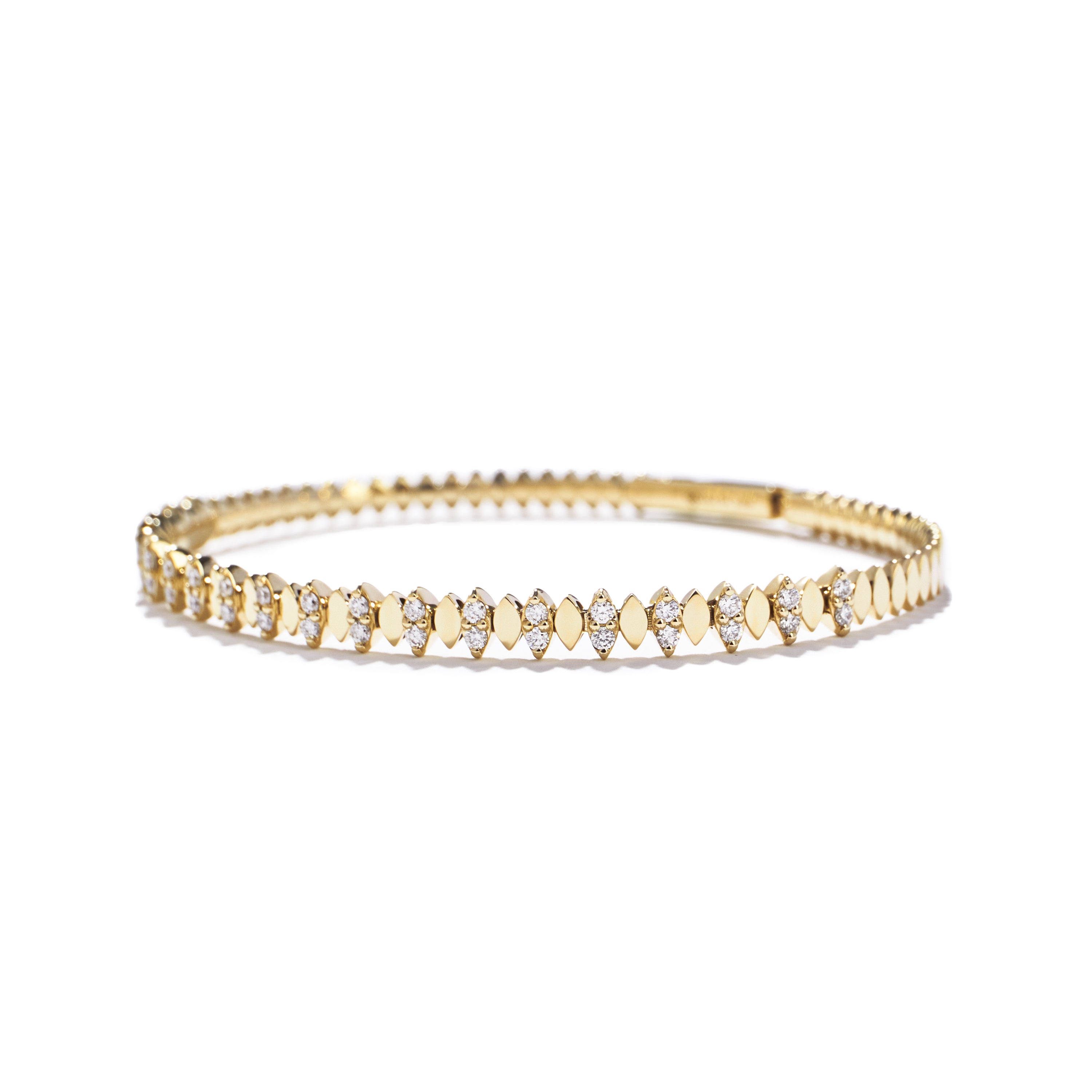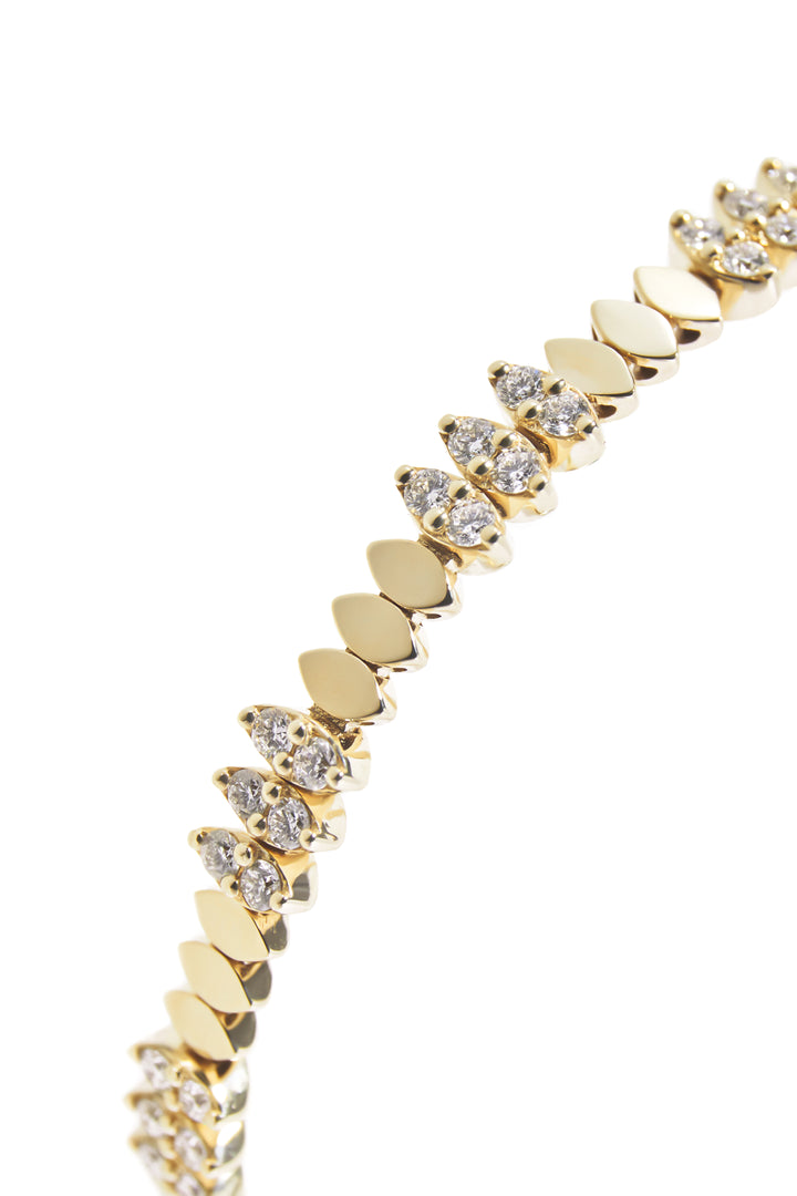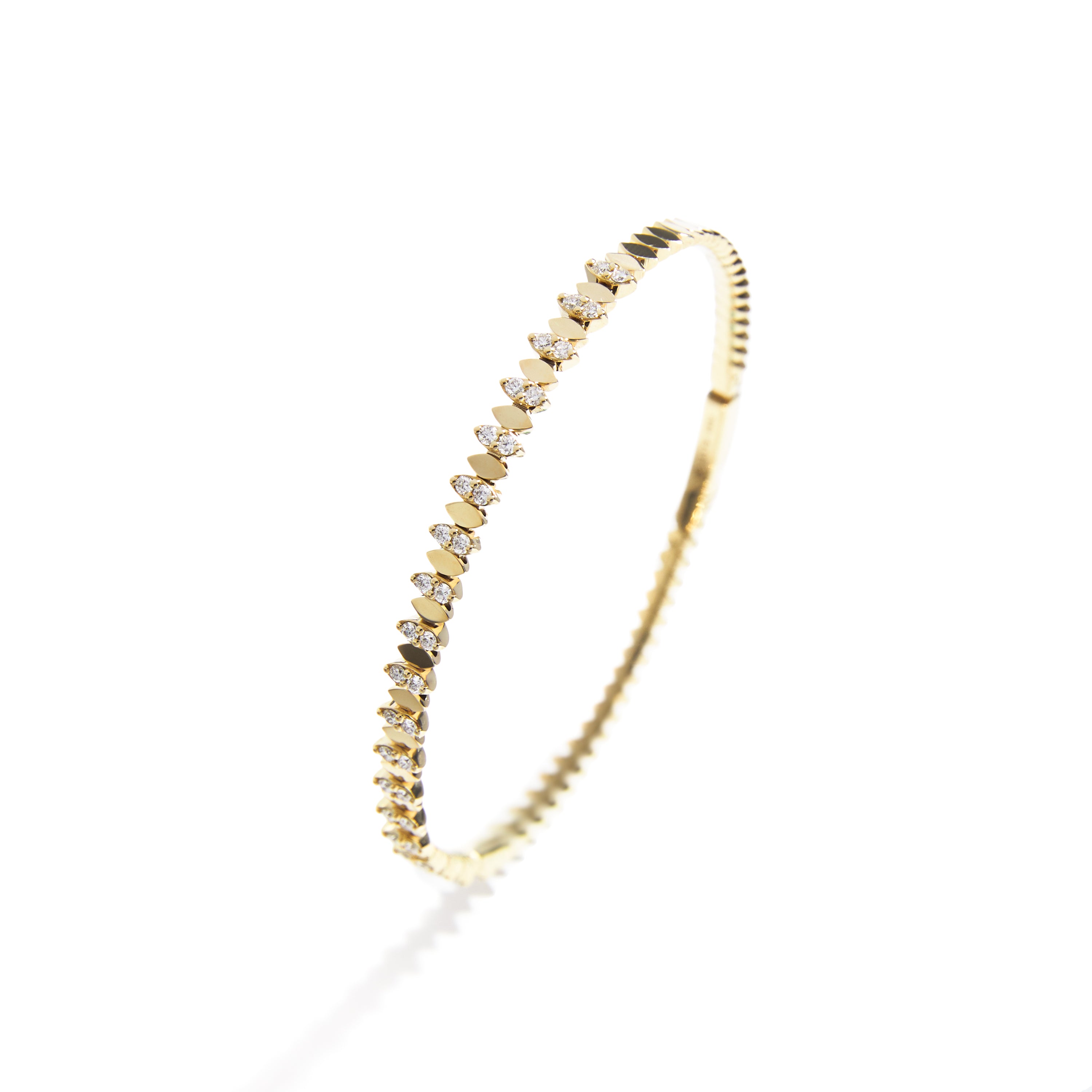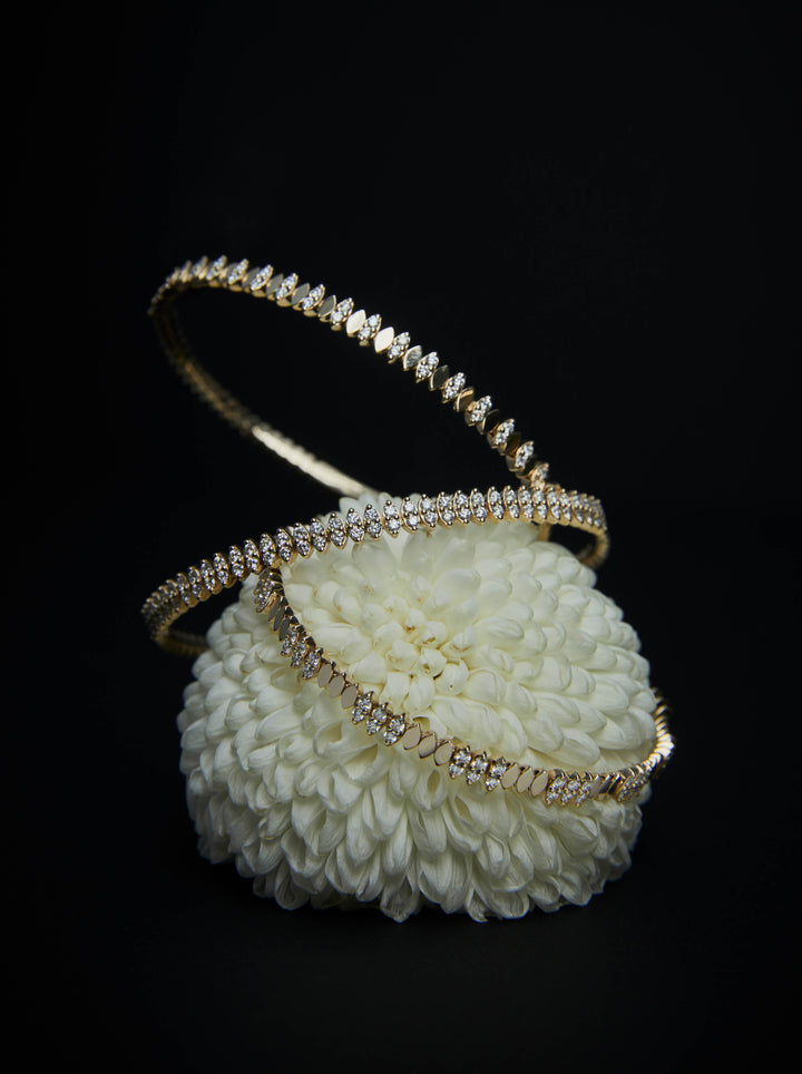 - 靈感取自花瓣曲線,手鐲以雙尖橢圓輪廓構成單元造型,層層排列如花瓣圍繞手腕,融合細緻鑲鑽與18K黃金,散發柔美又奢華的氣質。