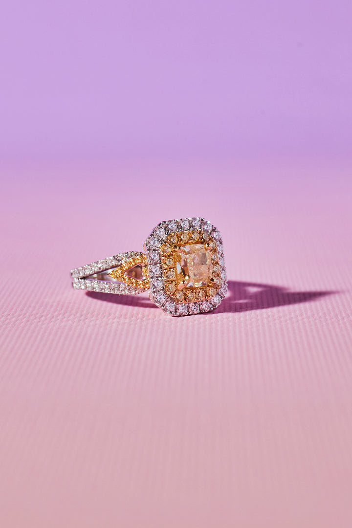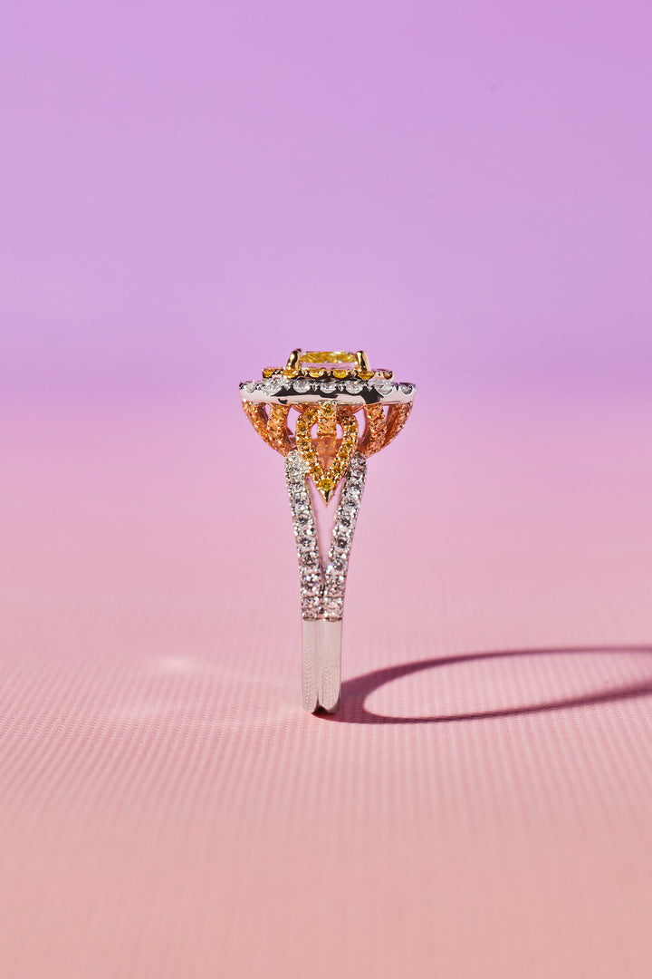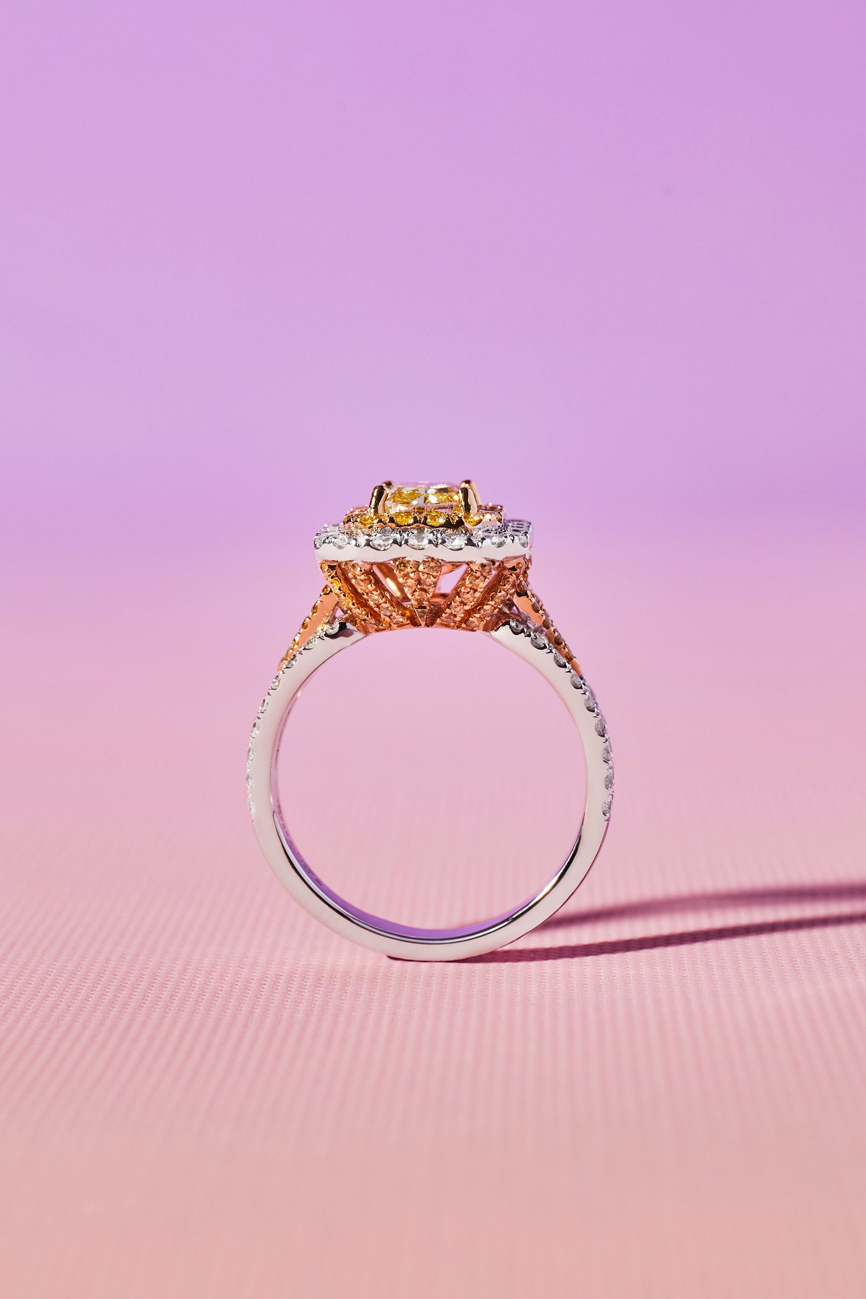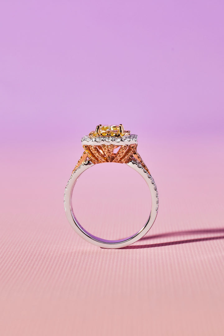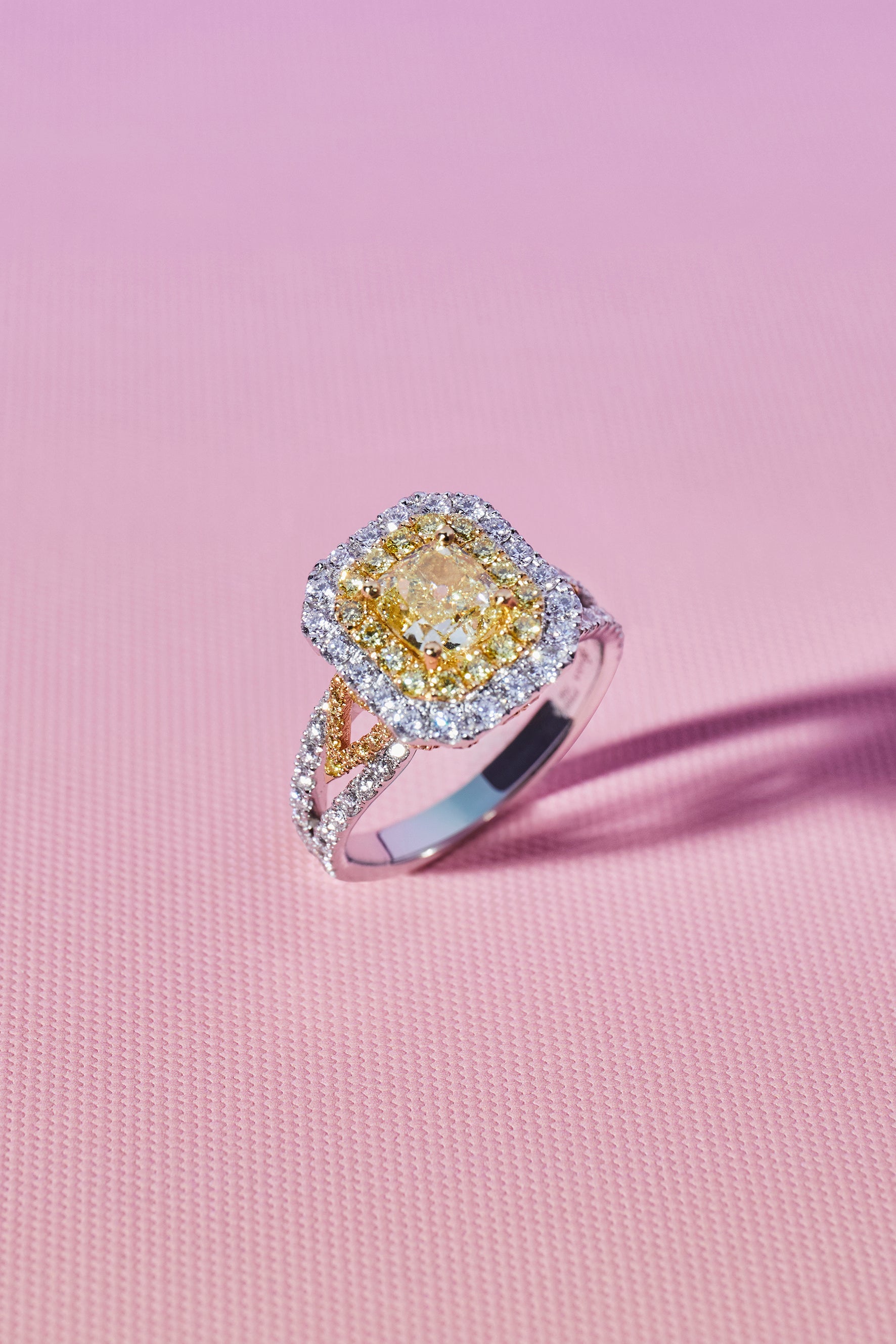 - 1.36ct 枕型 Fancy Yellow 黃鑽,濃郁而澄亮的金黃光澤,搭配雙圈密鑲設計。內圈黃鑽延續主石色澤,外圈白鑽折射更純淨的光芒,層層環繞放大視覺比例,讓主石在舉手間閃耀不止。