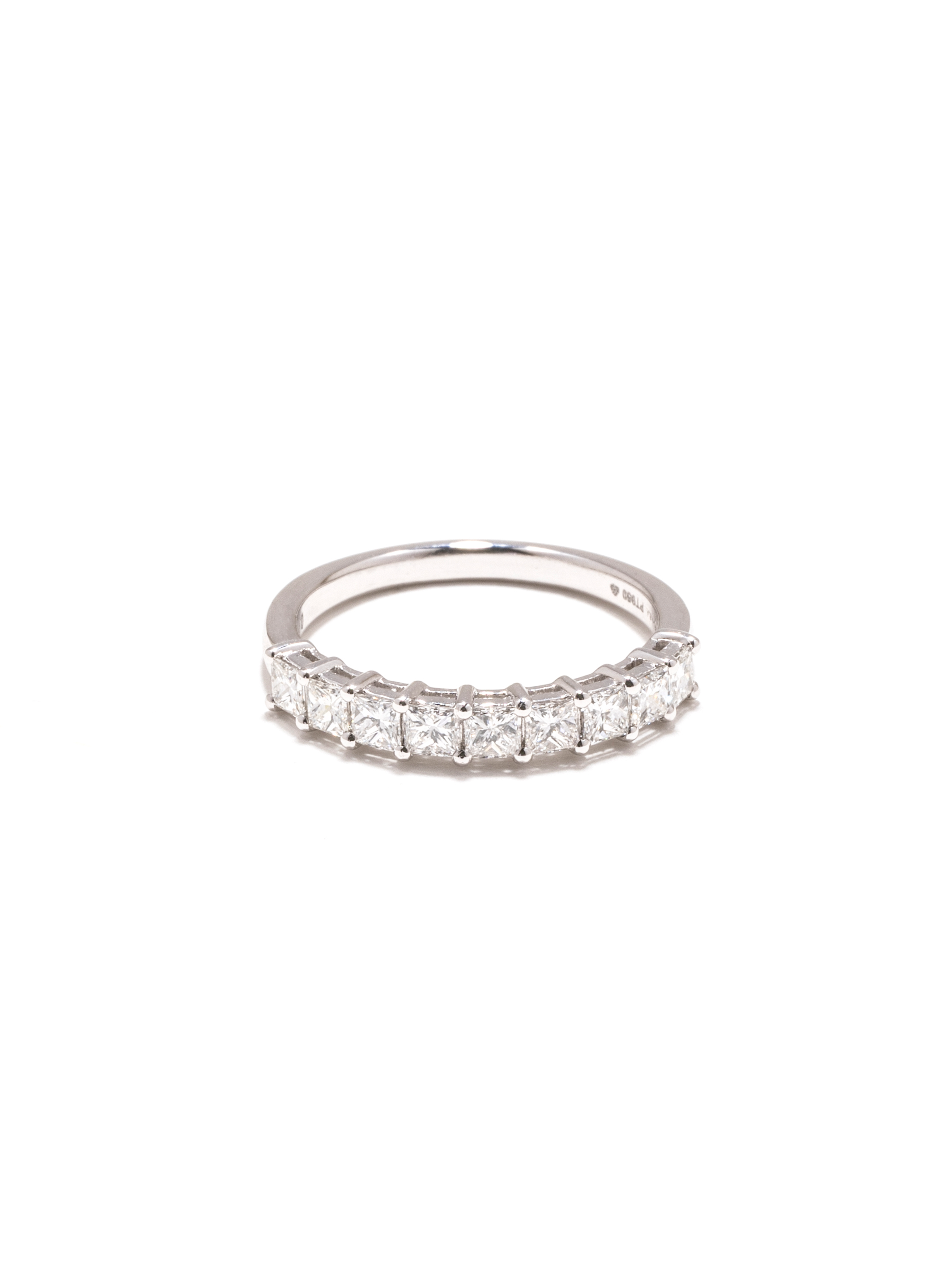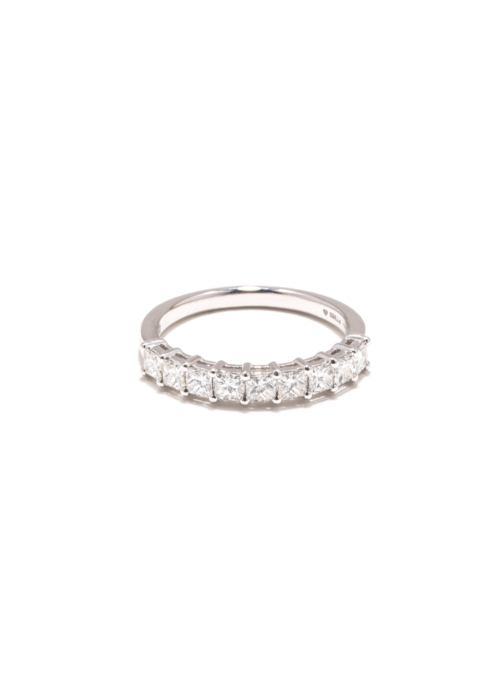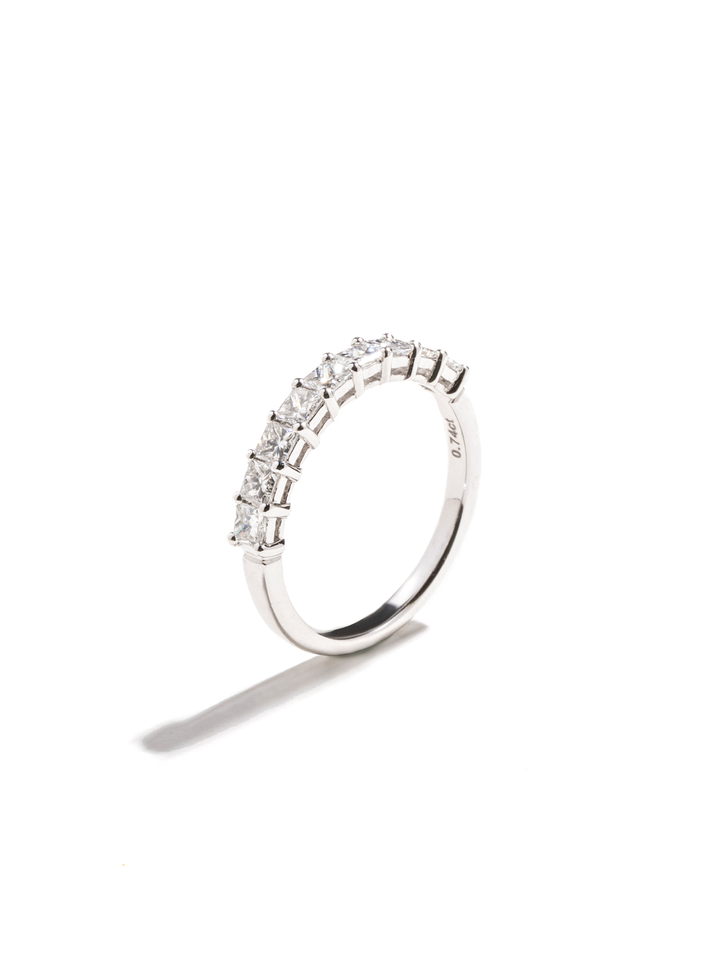 以俐落的公主方鑽排列成半圈設計,透過細緻爪鑲嵌固定每一顆鑽石,使光線能自由進入,展現明亮而純淨的火光。方形切割的幾何線條,為經典鑽戒注入現代感,低調卻極具存在感。