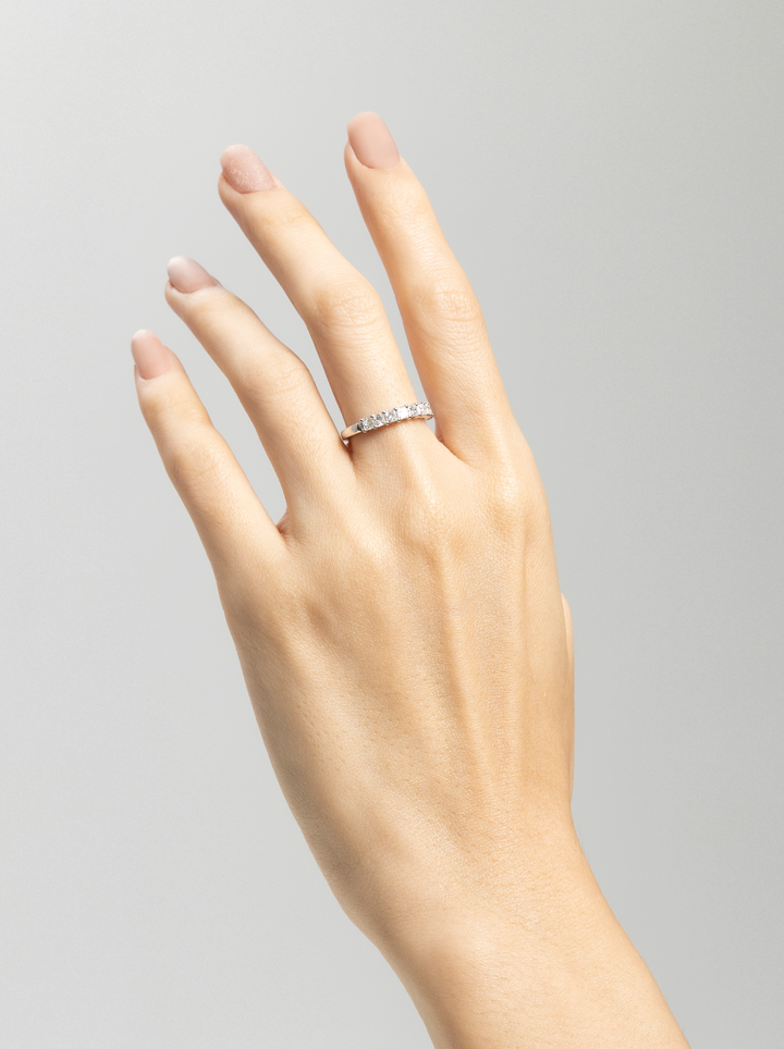 半圈鑽設計兼顧日常佩戴的舒適度與視覺層次,無論單戴或與婚戒、其他戒指疊戴,都能自然融入各種風格,成為歷久不衰的經典選擇。