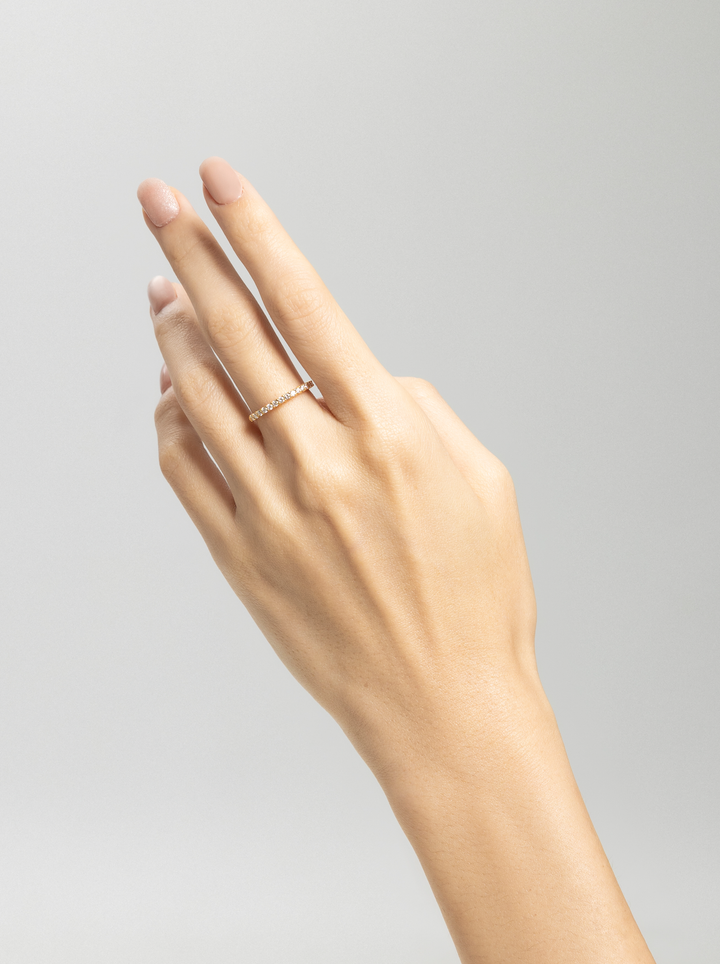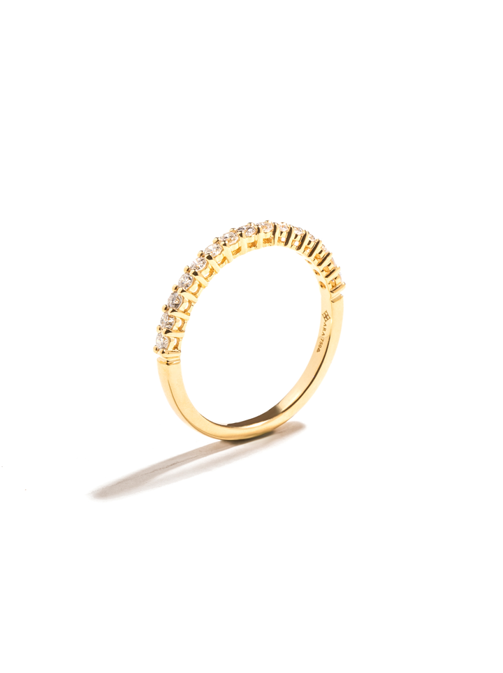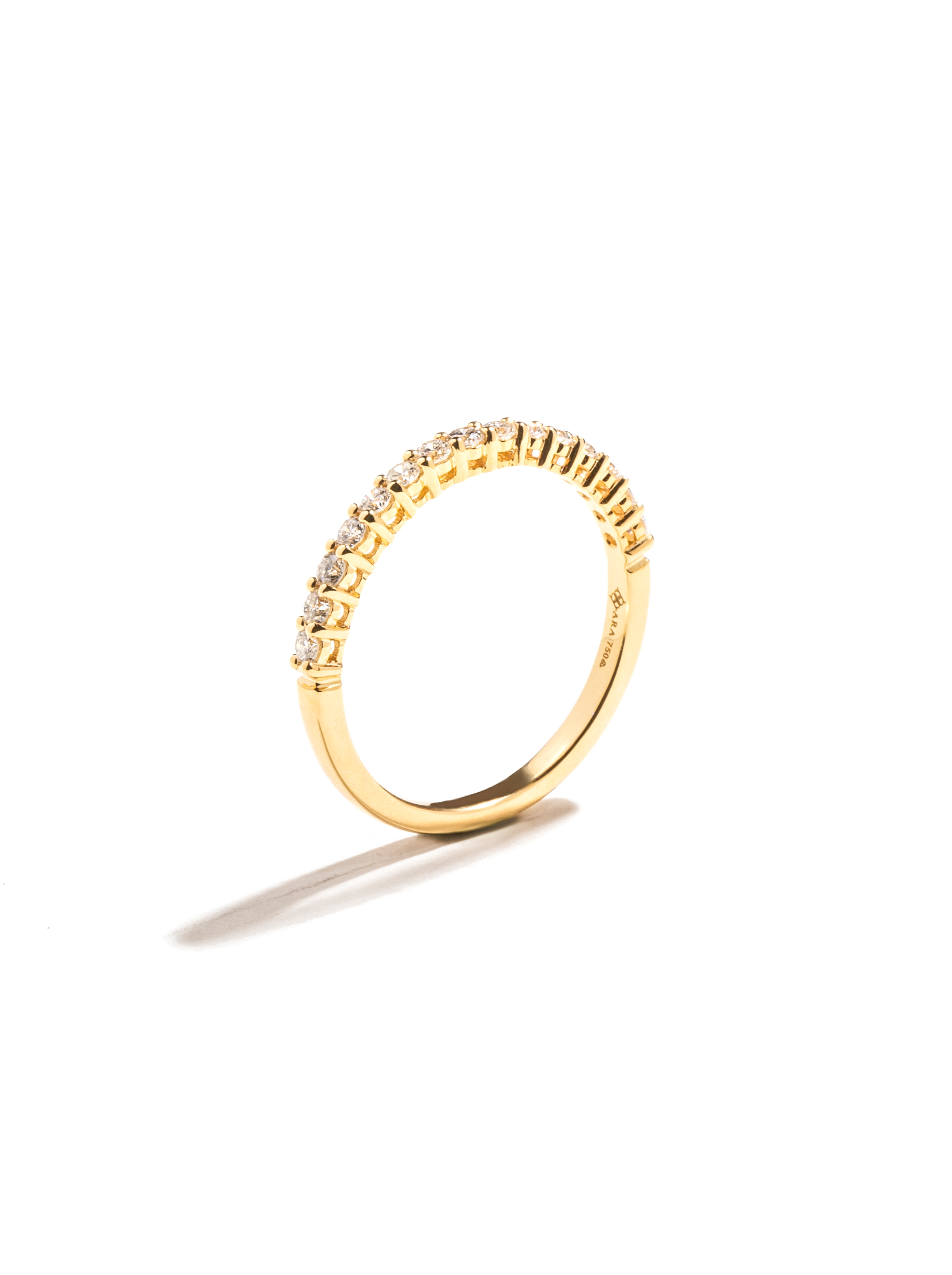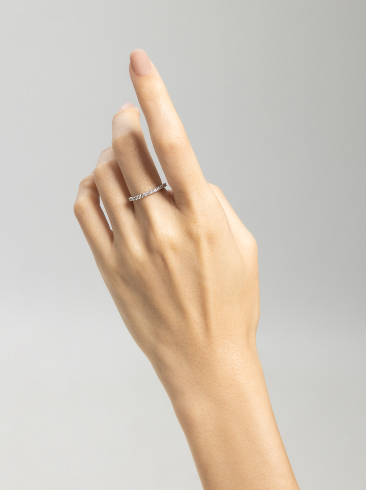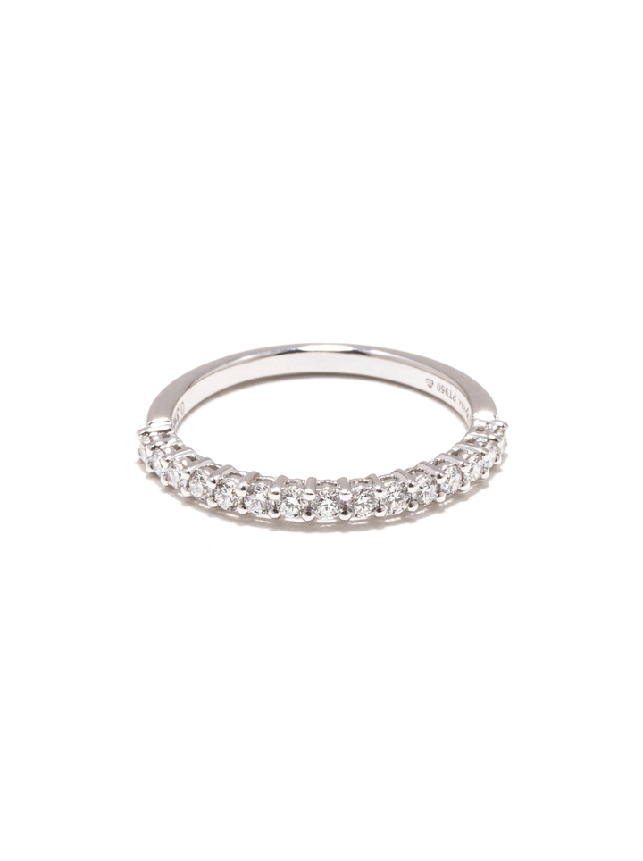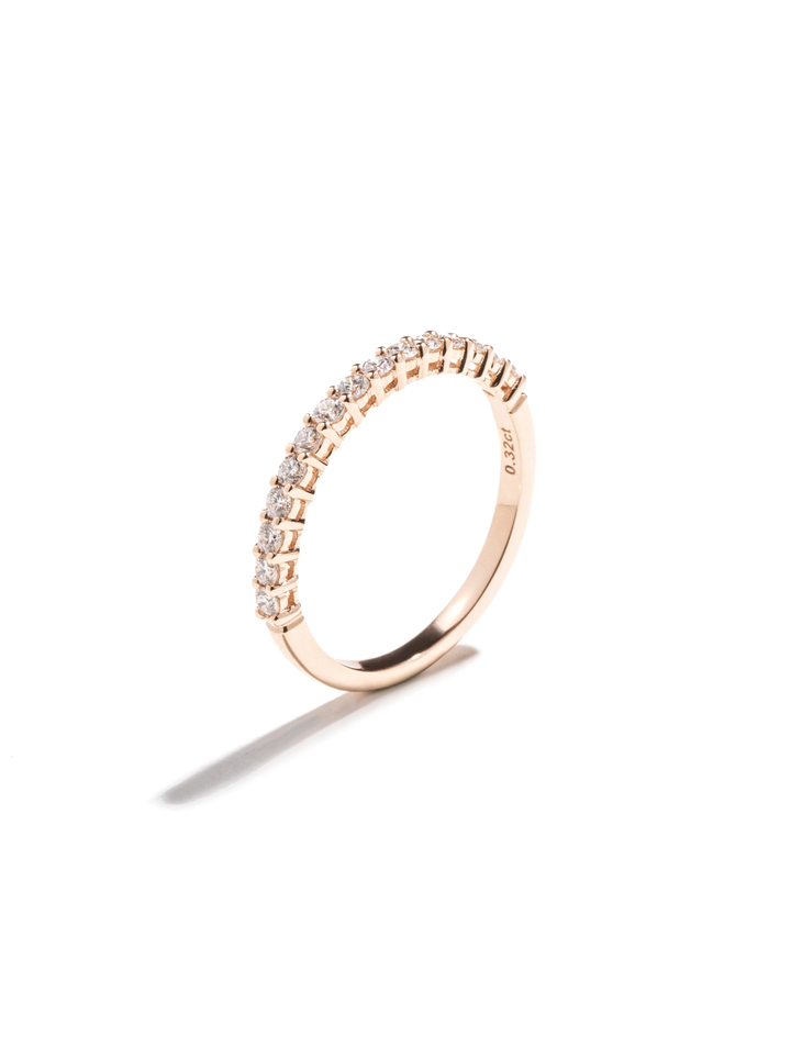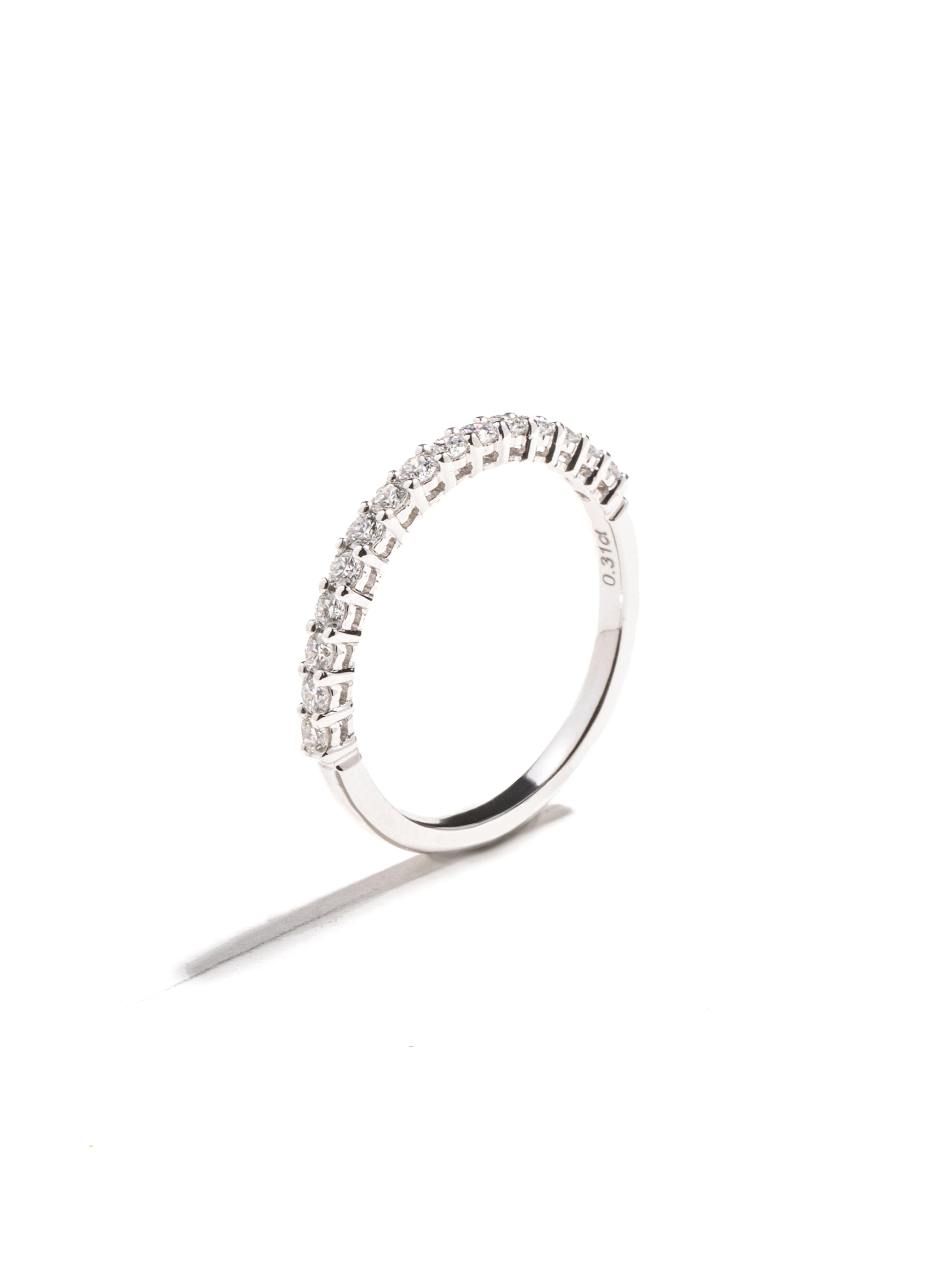 圓形明亮式切割鑽排列成半圈設計,透過細緻爪鑲嵌固定每一顆鑽石,展現明亮而純淨的火光。半圈鑽設計兼顧日常佩戴的舒適度與視覺層次,無論單戴或與婚戒、其他戒指疊戴,都能自然融入各種風格,成為歷久不衰的經典選擇。