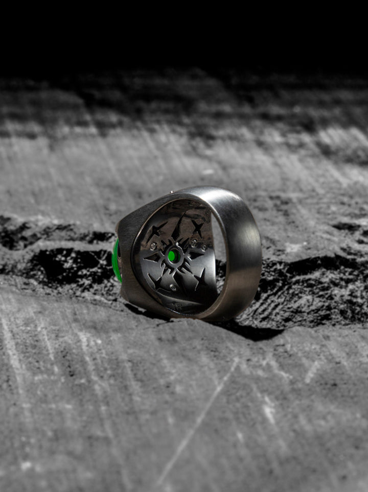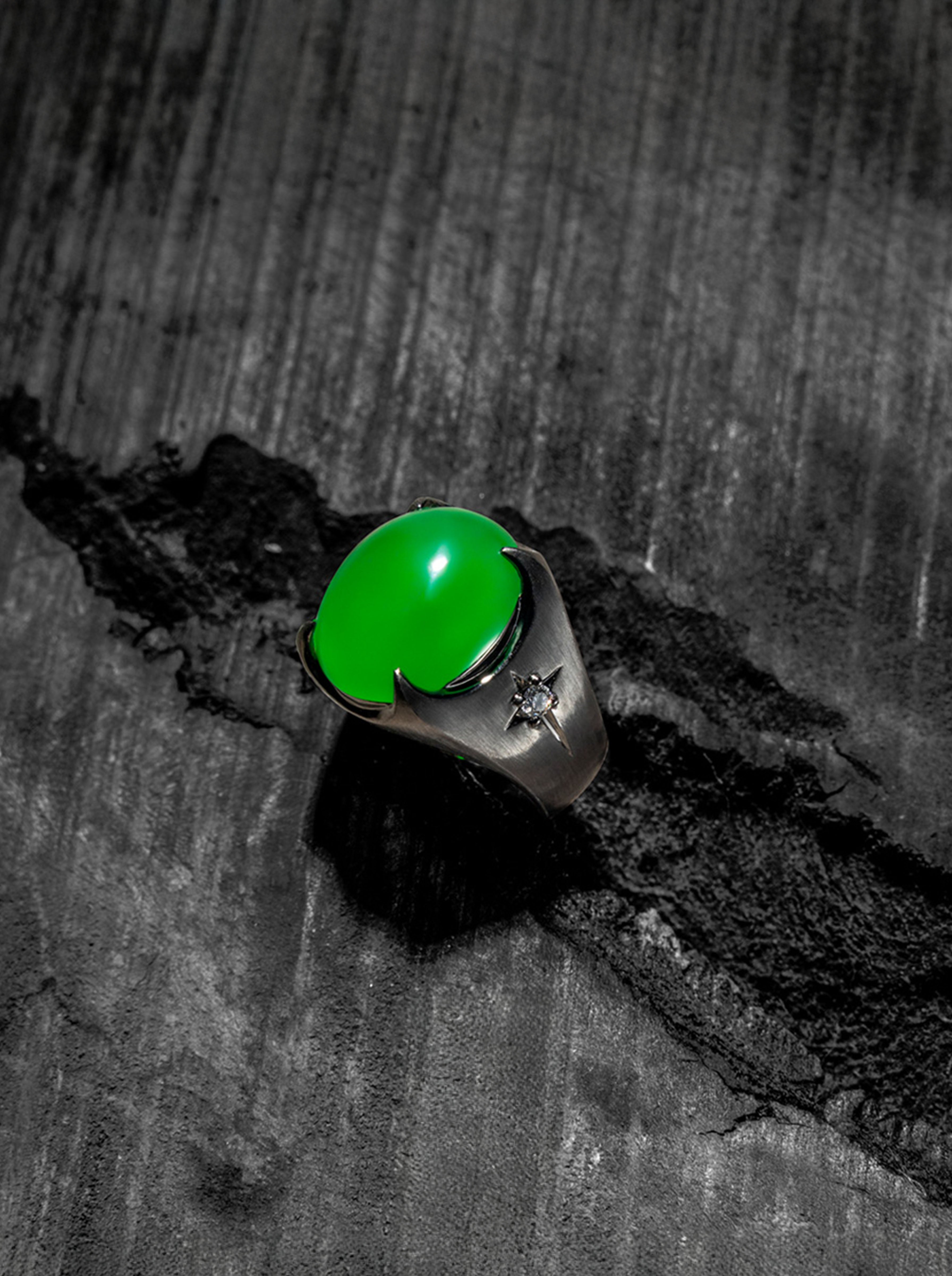 - 以「守護」為靈感,戒指的兩側巧妙地融入了鎧甲和兵器上的刻紋元素,展現出剛硬而俐落的線條,環繞著一顆圓潤的翡翠寶石,不僅增加了戒指的份量感,也注入了視覺上的吸引力。