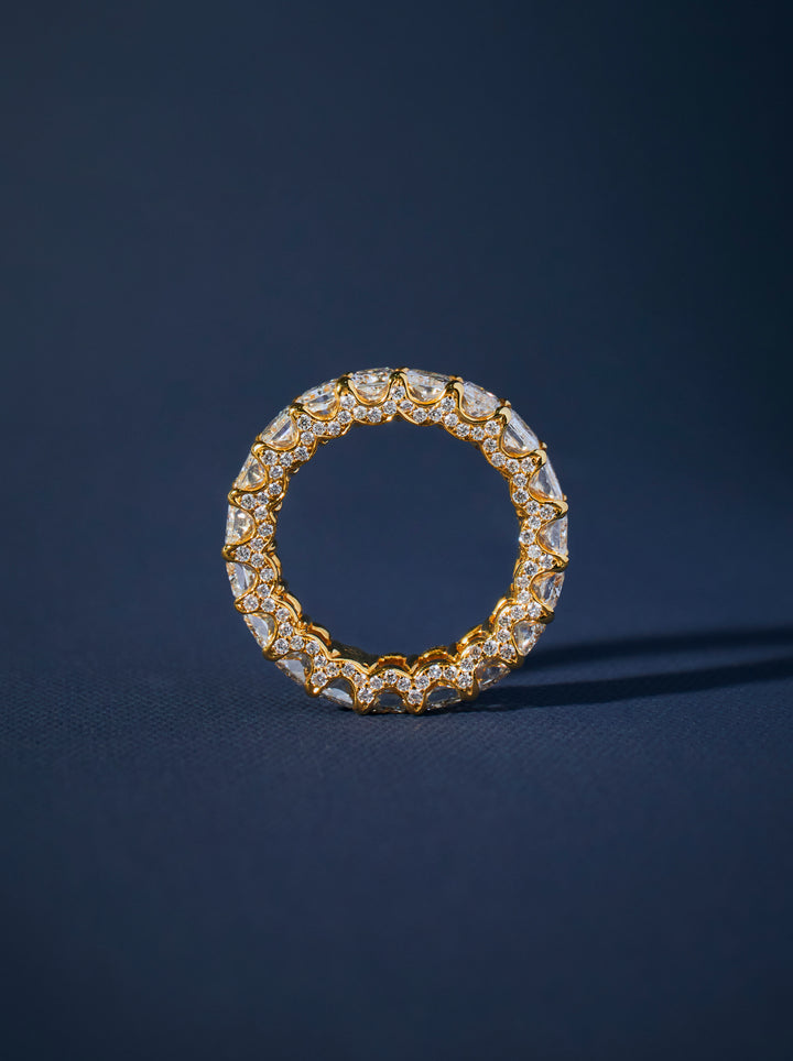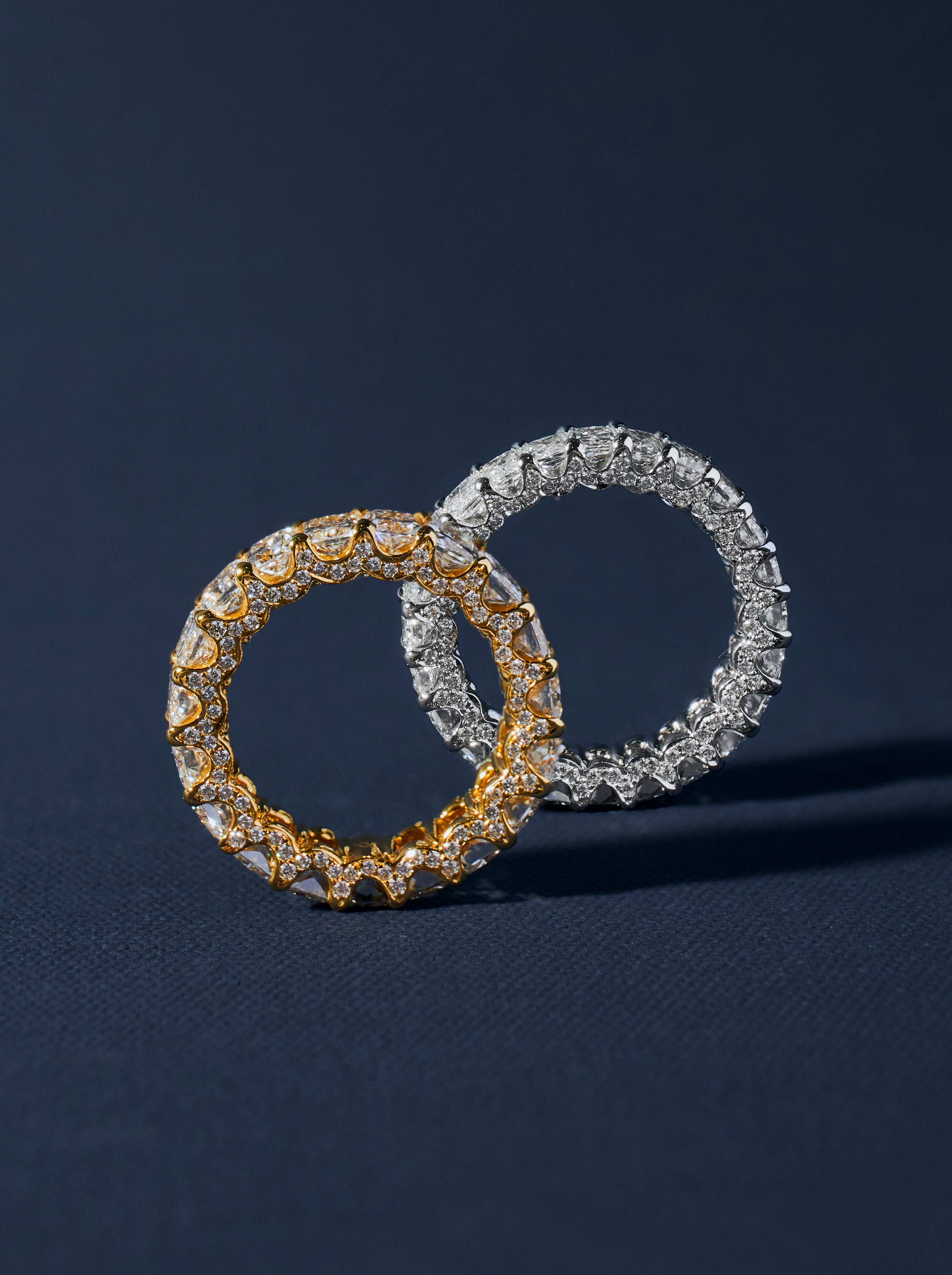 - 整圈鑽石以 18K 黃金與 PT950 鉑金精工打造,厚實戒身讓火光被牢牢托起。戒圈側面亦鑲滿細鑽,讓主石的光影層次更為立體,閃耀宛如無盡的光之迴廊,是熱愛奢華風格的人絕對不能錯過的耀眼之作