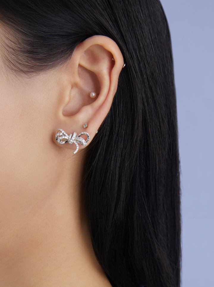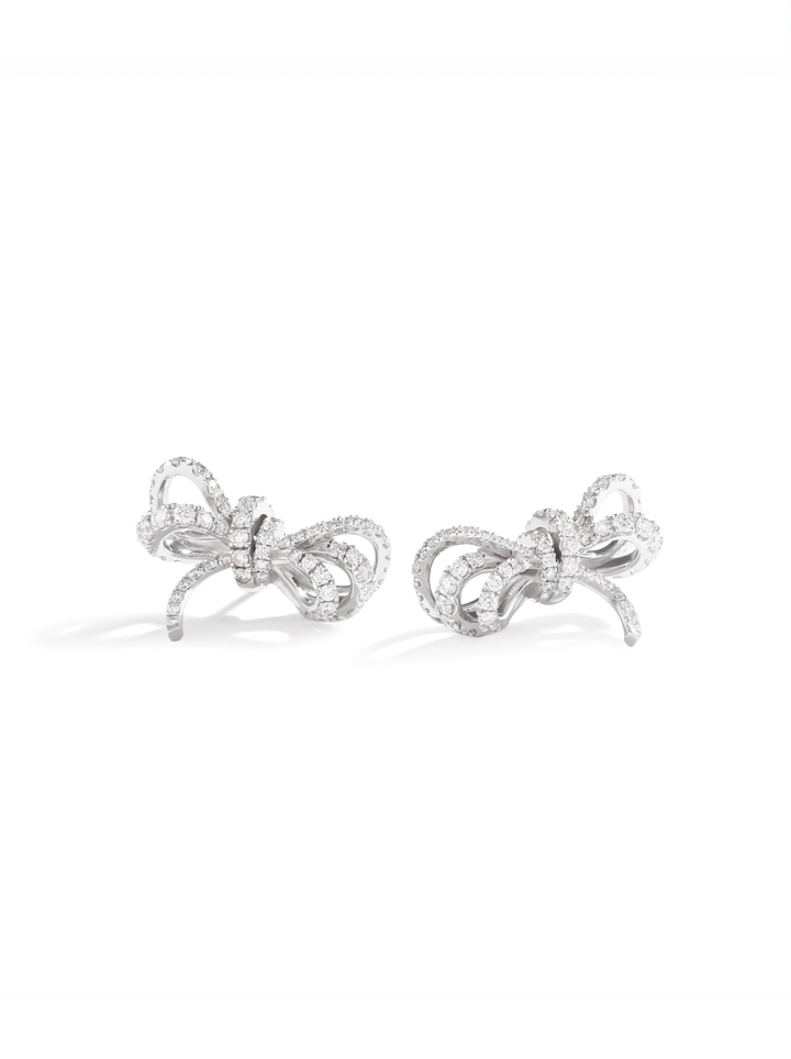 輕巧優雅的蝴蝶結線條,以立體弧度勾勒柔美姿態,鑲嵌滿鋪細鑽後散發如星光般的奢華光芒。每一次轉頭、每一次微笑,都能捕捉到耀眼亮點。