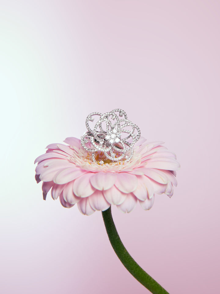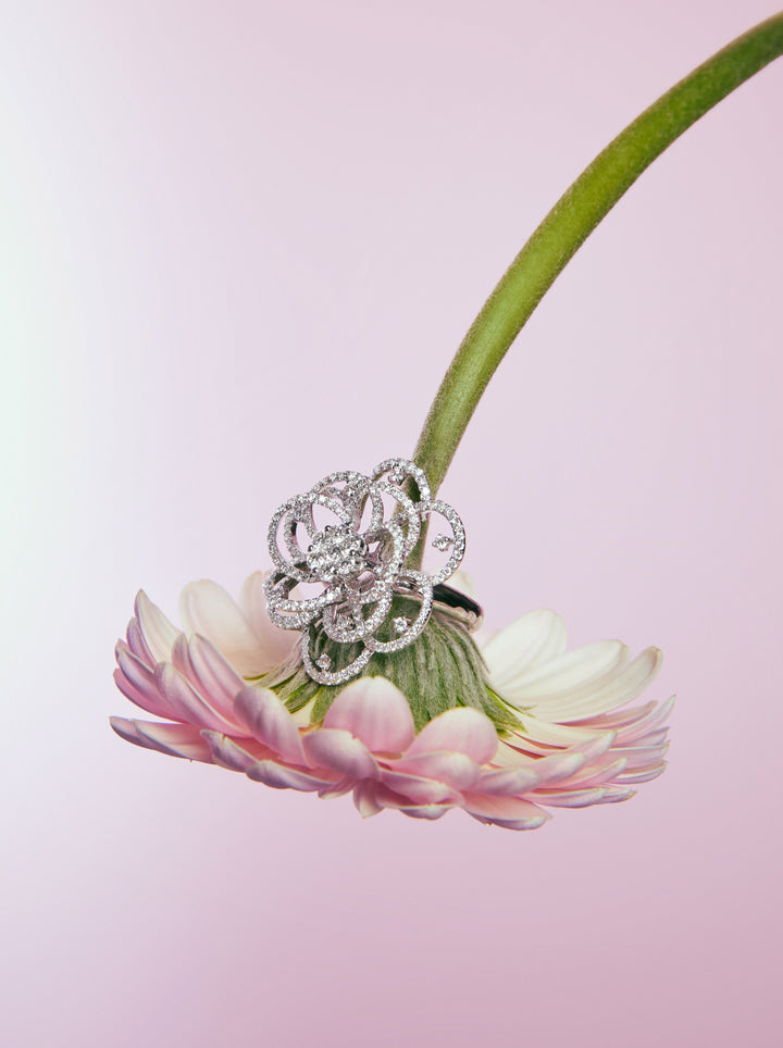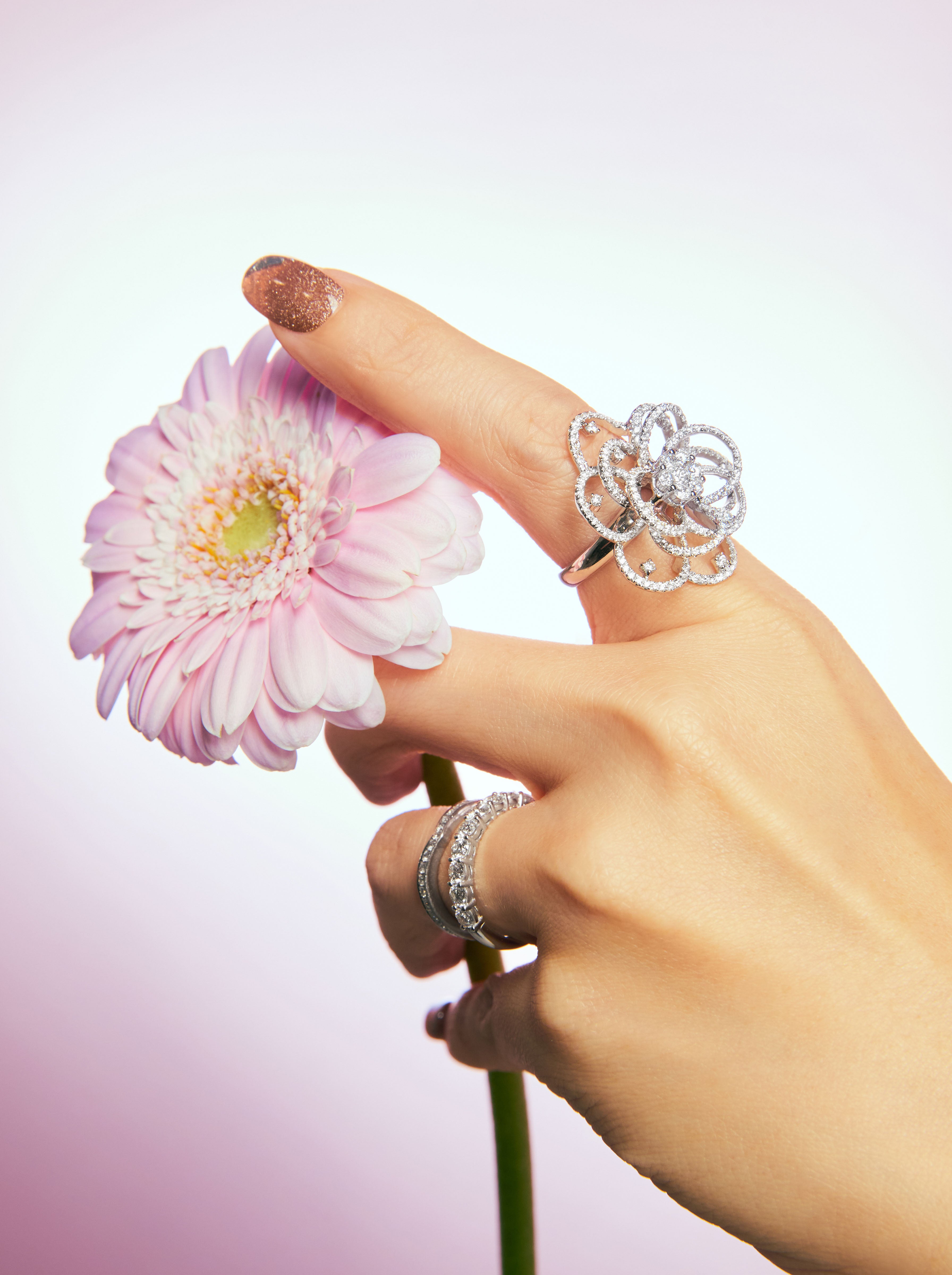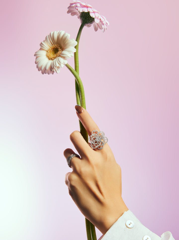 - 在優美的圓弧曲線上緊密鑲嵌無數閃耀的小鑽,勾勒出飽滿的花瓣,展現出繁花盛開的姿態,猶如立體的雕塑品。鏤空的線條設計為戒指注入了輕盈感,佩戴在手上的視覺比例又顯得相當大氣。