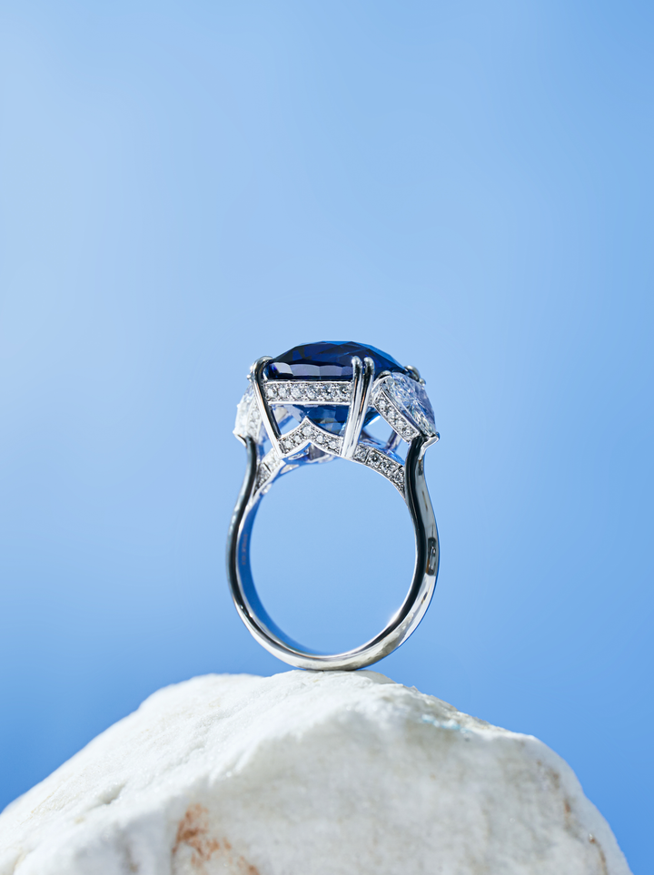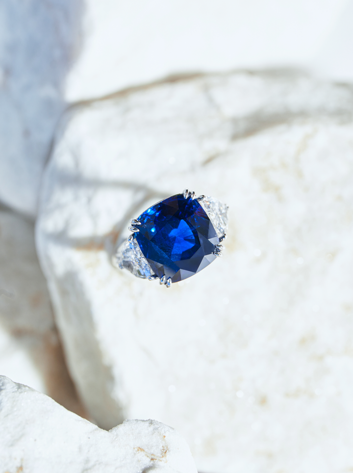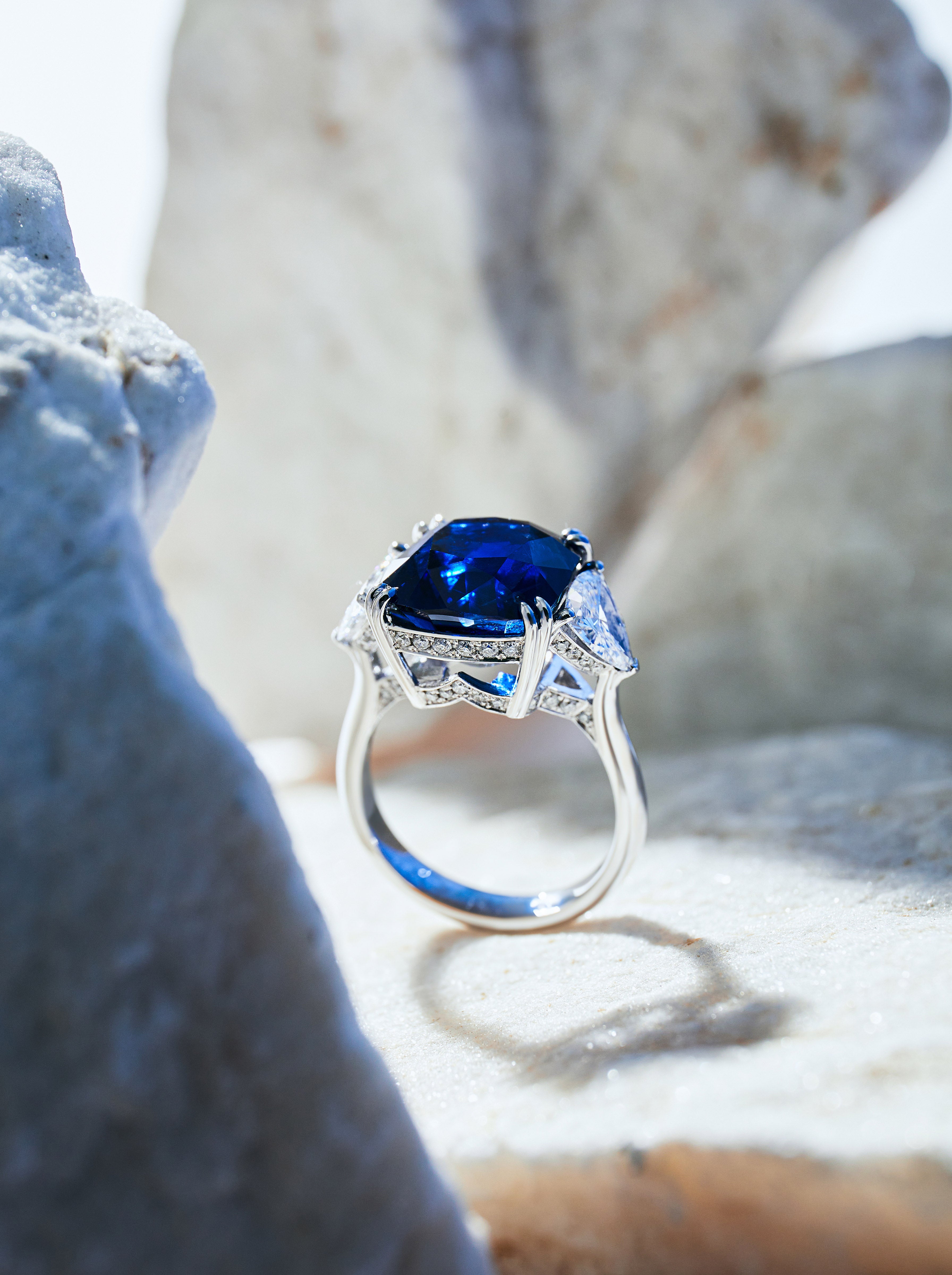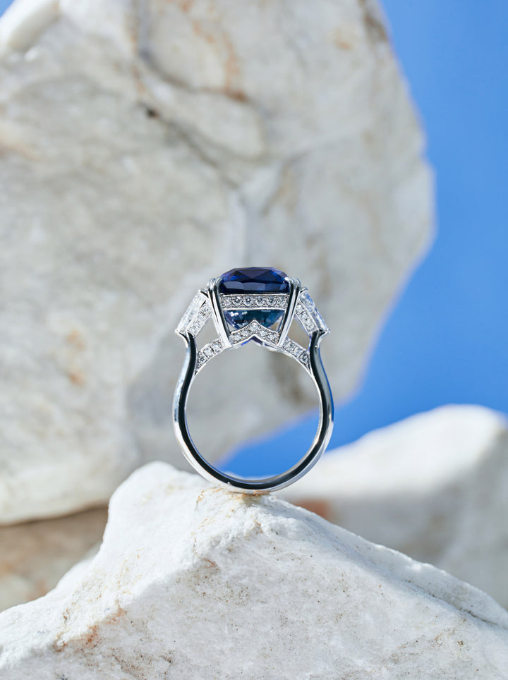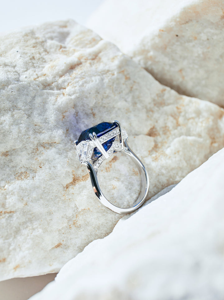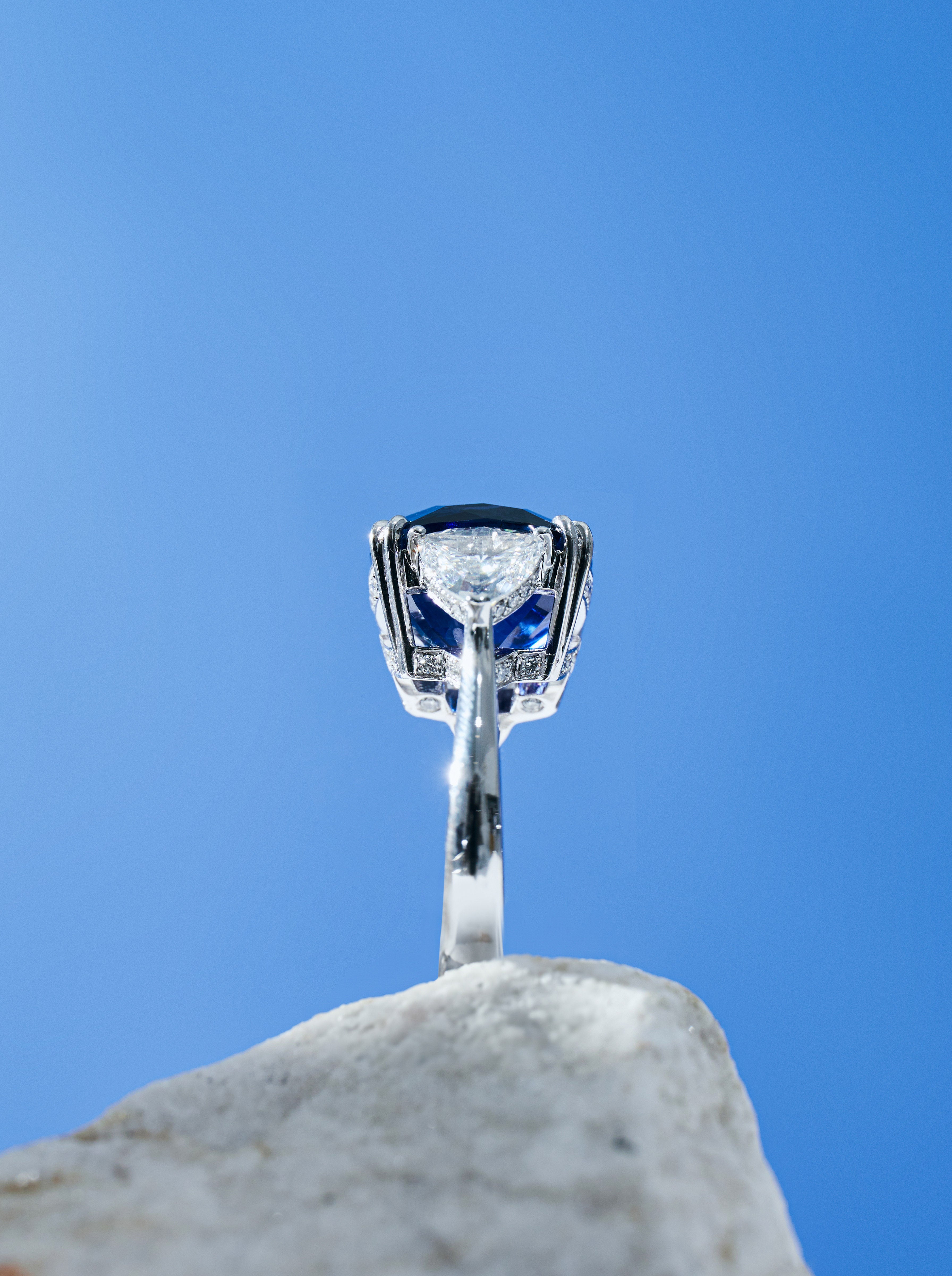 - 為了讓這顆經典的枕型切割藍寶石能徹底獨綻風采,ARA 總監在設計時特意不在戒角鑲鑽,而是在寶石的兩斜側、搭配了兩顆三角形D/VVS等級的GIA鑽石;為追求完美,這兩顆三角鑽石,也是由 ARA Fine Jewellery 送到以色列的頂級切模廠特別磨製而成。
