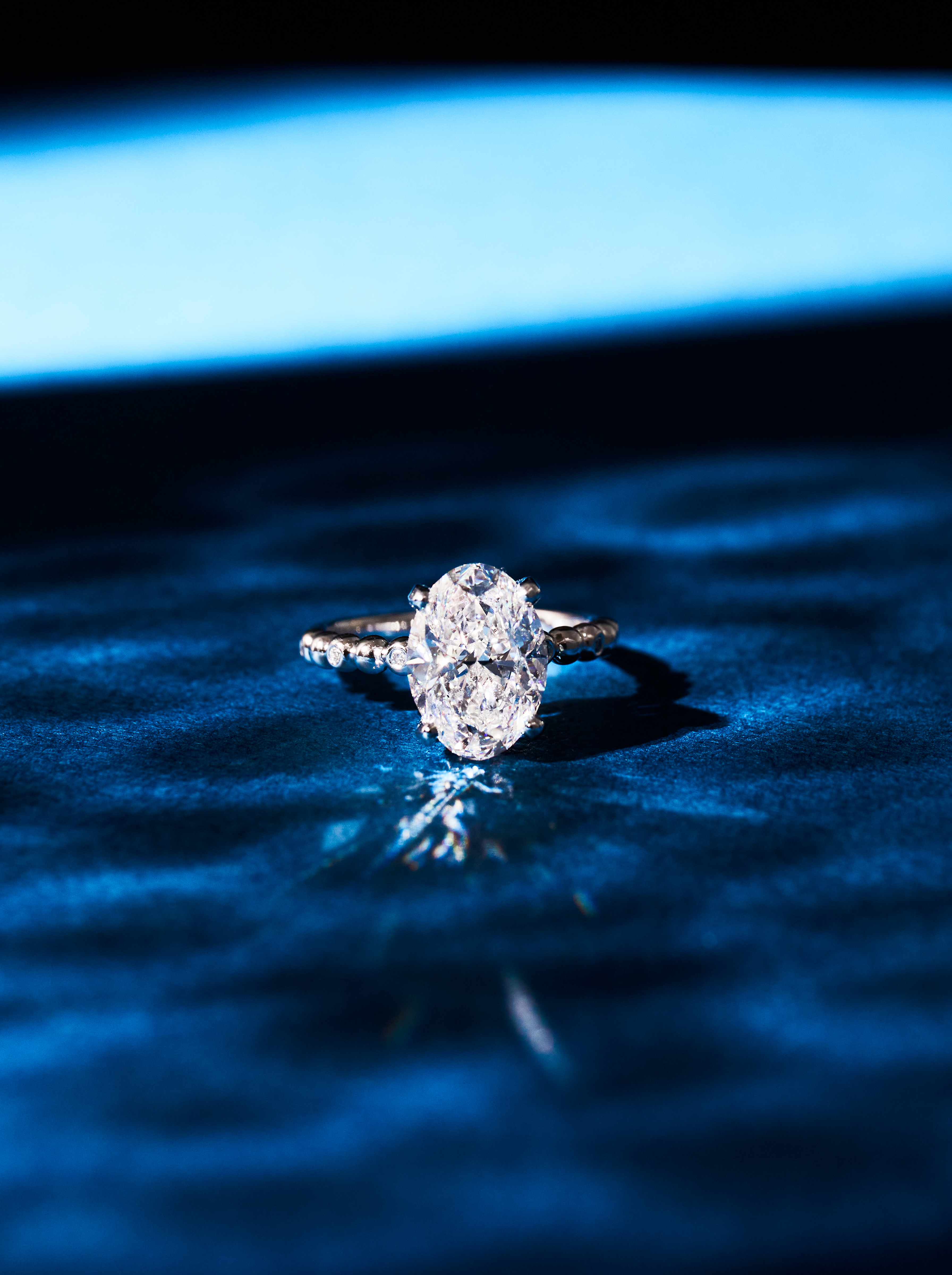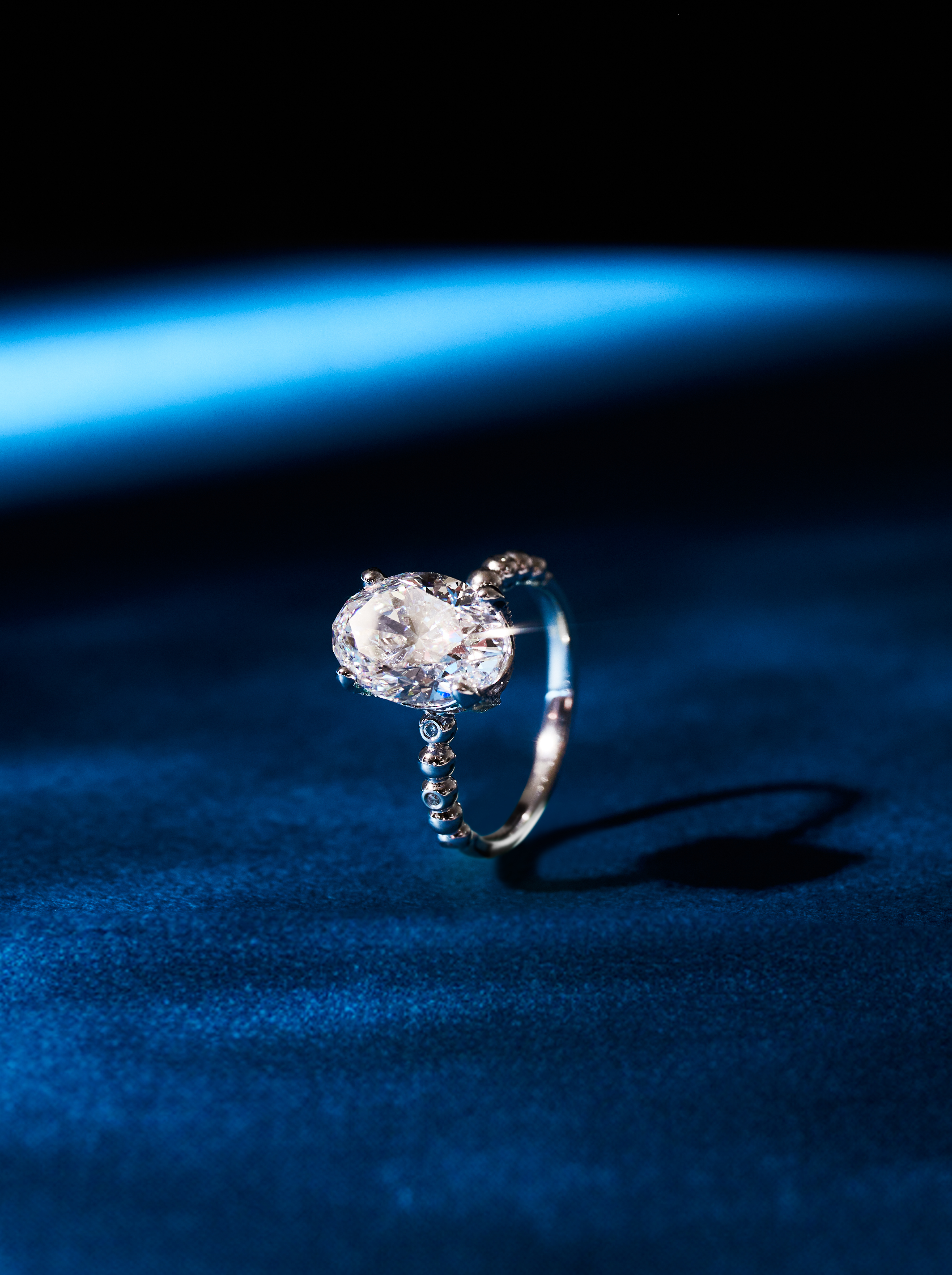 相比圓形明亮式鑽石,橢圓形的拉長效果能讓手指看起來更纖細修長,也能展現柔美高貴的氣息。