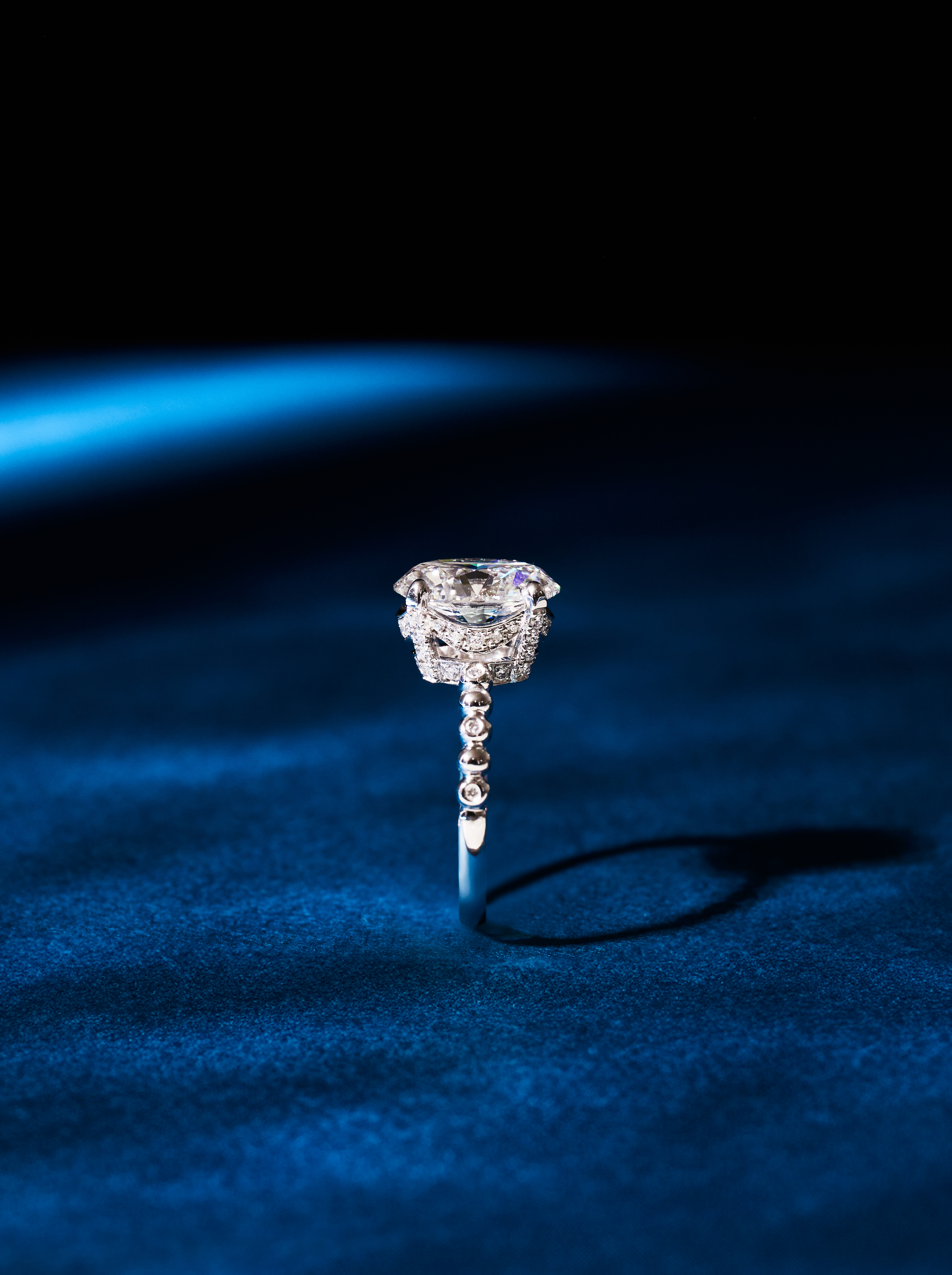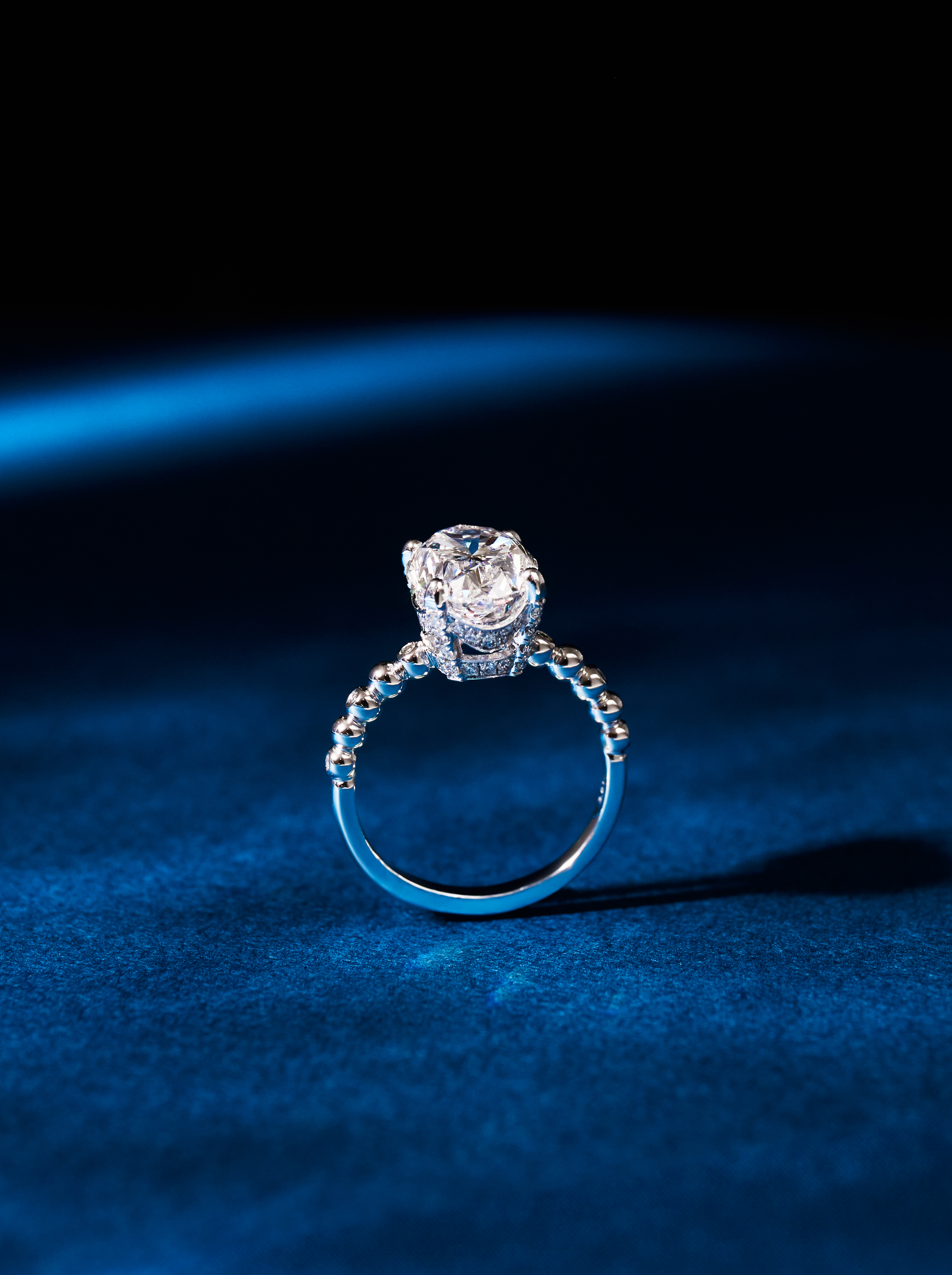 為呼應立體的鑲鑽戒台設計,戒圈以細緻的圓珠線條所打造,上頭也鑲嵌了幾顆小鑽,其微幅突起的質感,襯托了主鑽的光彩,無論正面或側面欣賞,都同樣動人。