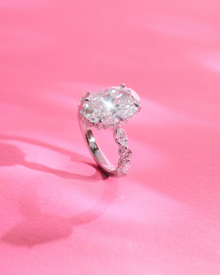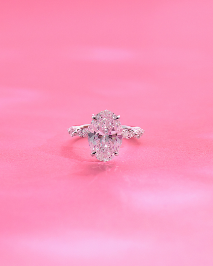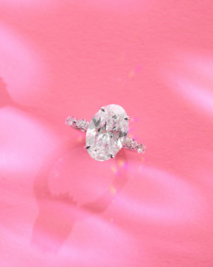 以 4.01 克拉橢圓形切割鑽石為核心,經 GIA 鑑定為 D 色、VS1 淨度,並擁有 2 Excellent 切工與無螢光的頂級條件。