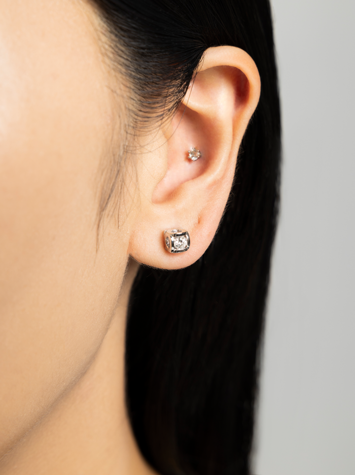 由 18K 金打造的 a 字形立方體托座,擁有方中帶圓的簡約設計,從正面俯視觀看,能為中央的鑽石表面增添視覺份量,若透過側面鏤空的圓形線條,則能欣賞到鑽石的底尖處。