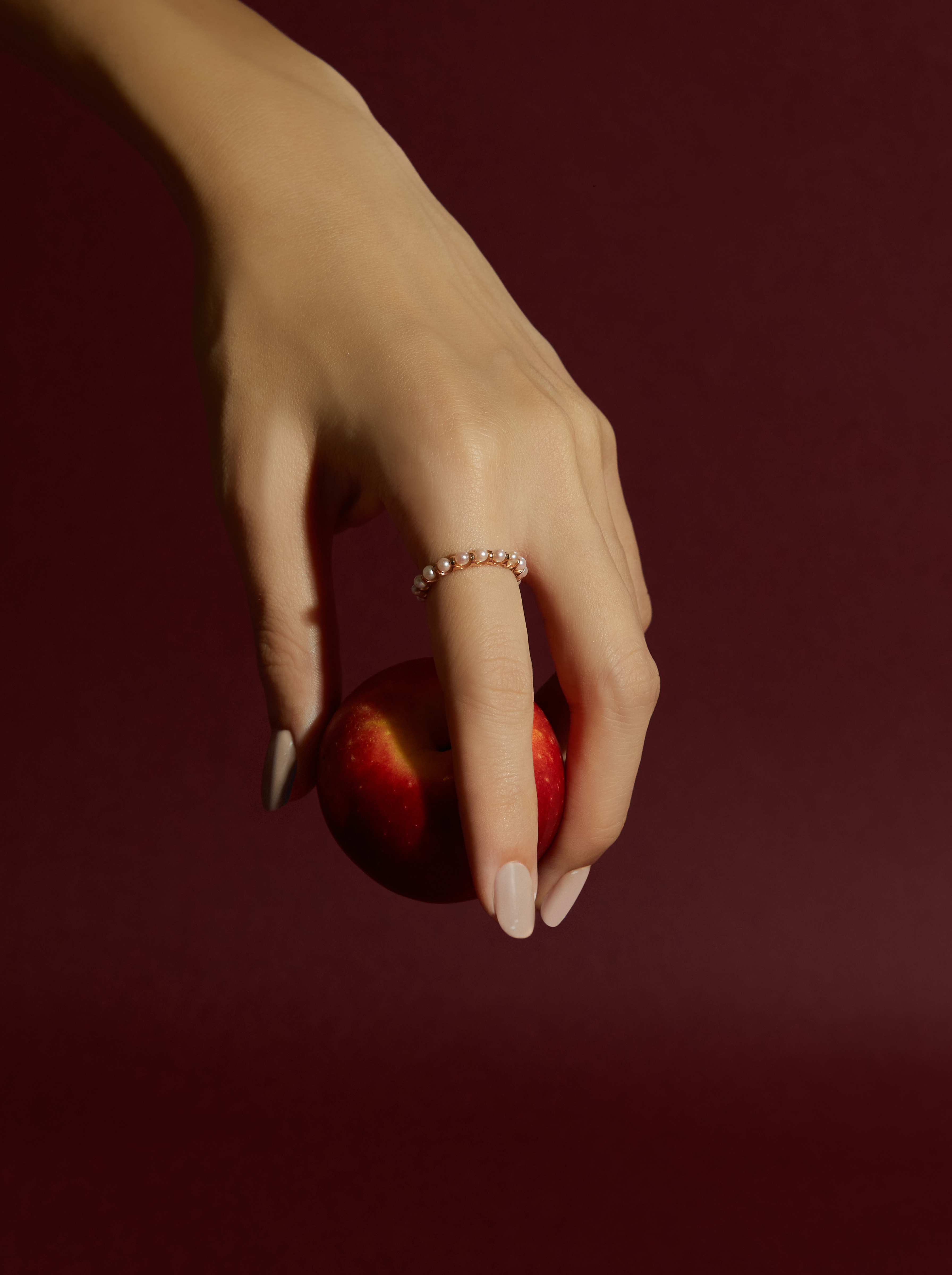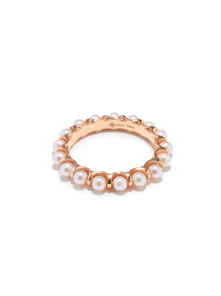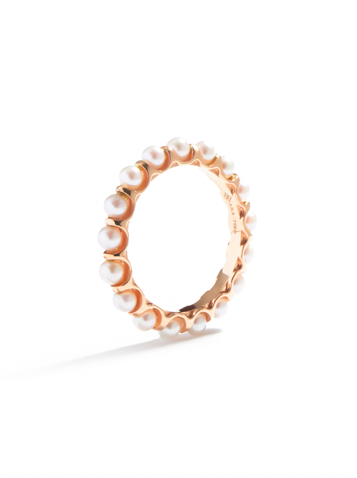精選約 3mm 的 Baby 珠,環繞於戒圈四周,搭配細緻光澤的 18K 金與 PT950 鉑金,柔與剛在指尖相遇。珍珠的圓潤溫柔與貴金屬的堅韌光影相互交織,低調卻極具存在感。無論單獨佩戴、疊搭鑽戒,或混搭其他風格戒指,都能展現獨特氣質,為日常造型增添精緻亮點。