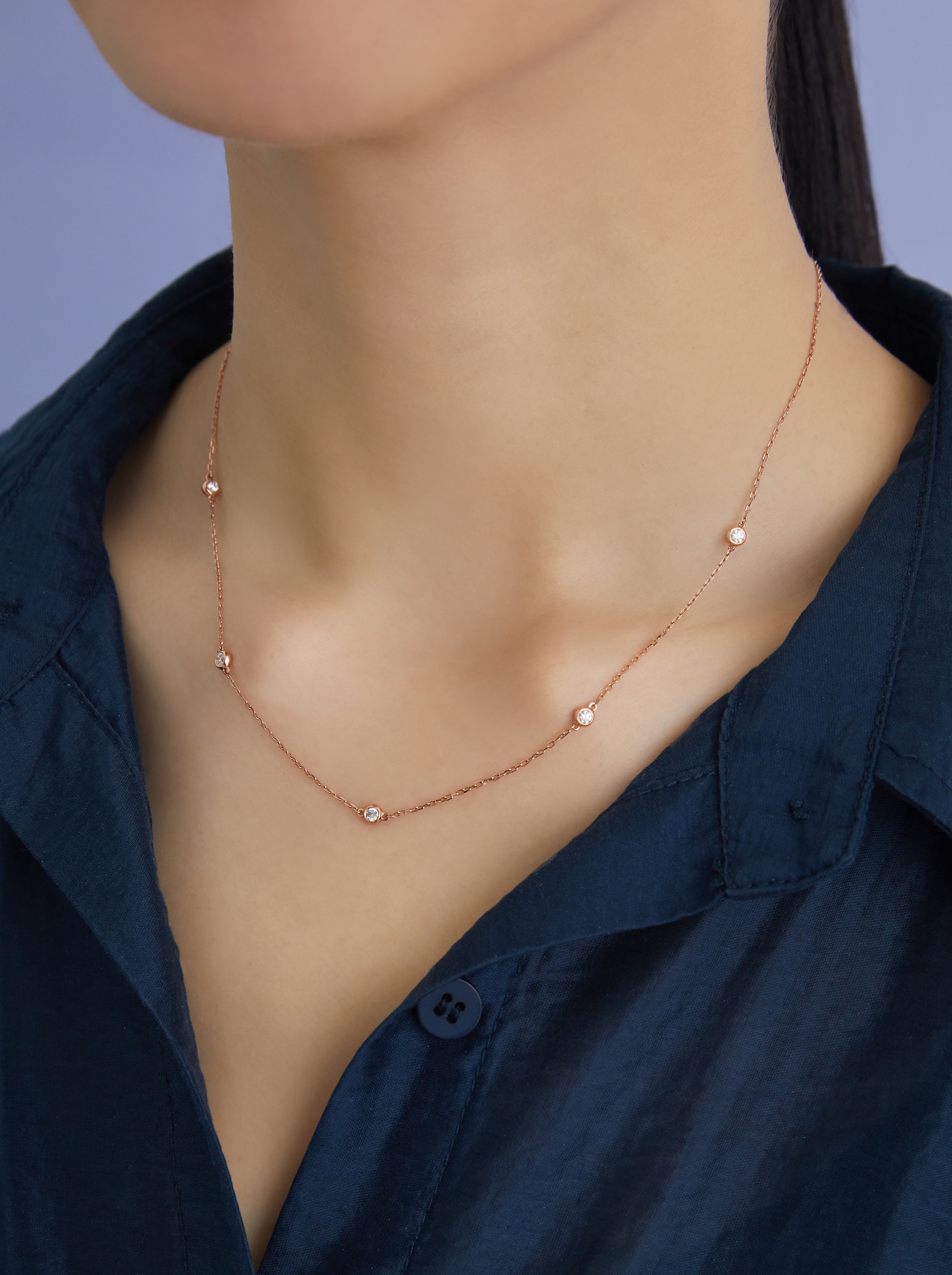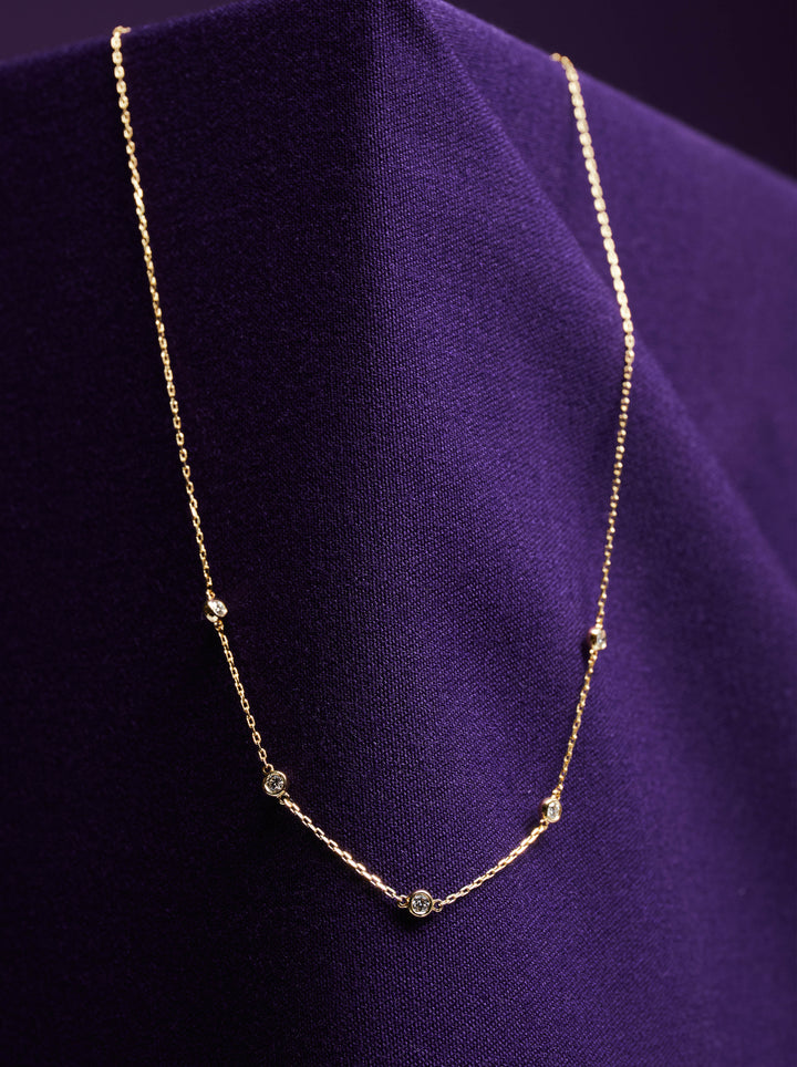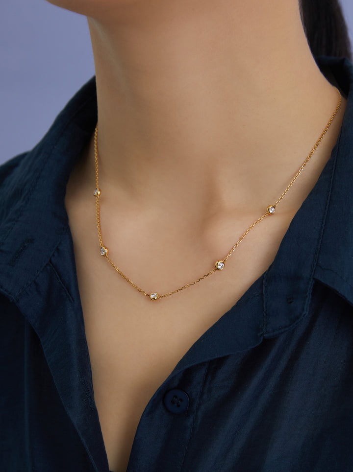 擁有極簡卻不失精緻的設計,五顆圓鑽以 18K 金包鑲工藝分布於鎖骨間,勾勒出乾淨俐落的線條感。不同於爪鑲的高調閃爍,包鑲光澤細膩內斂,日常佩戴更舒適,也不易勾衣。
